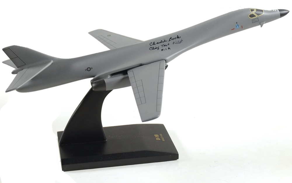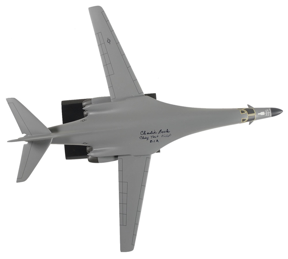 Test pilot. Scale model of a B-1-B signed in black felt tip, “Charlie Bock, Chief Test Pilot, B-1-B.” In fine condition with the slightly irregular ink adhesion to “Pilot.” RRAuction COA.