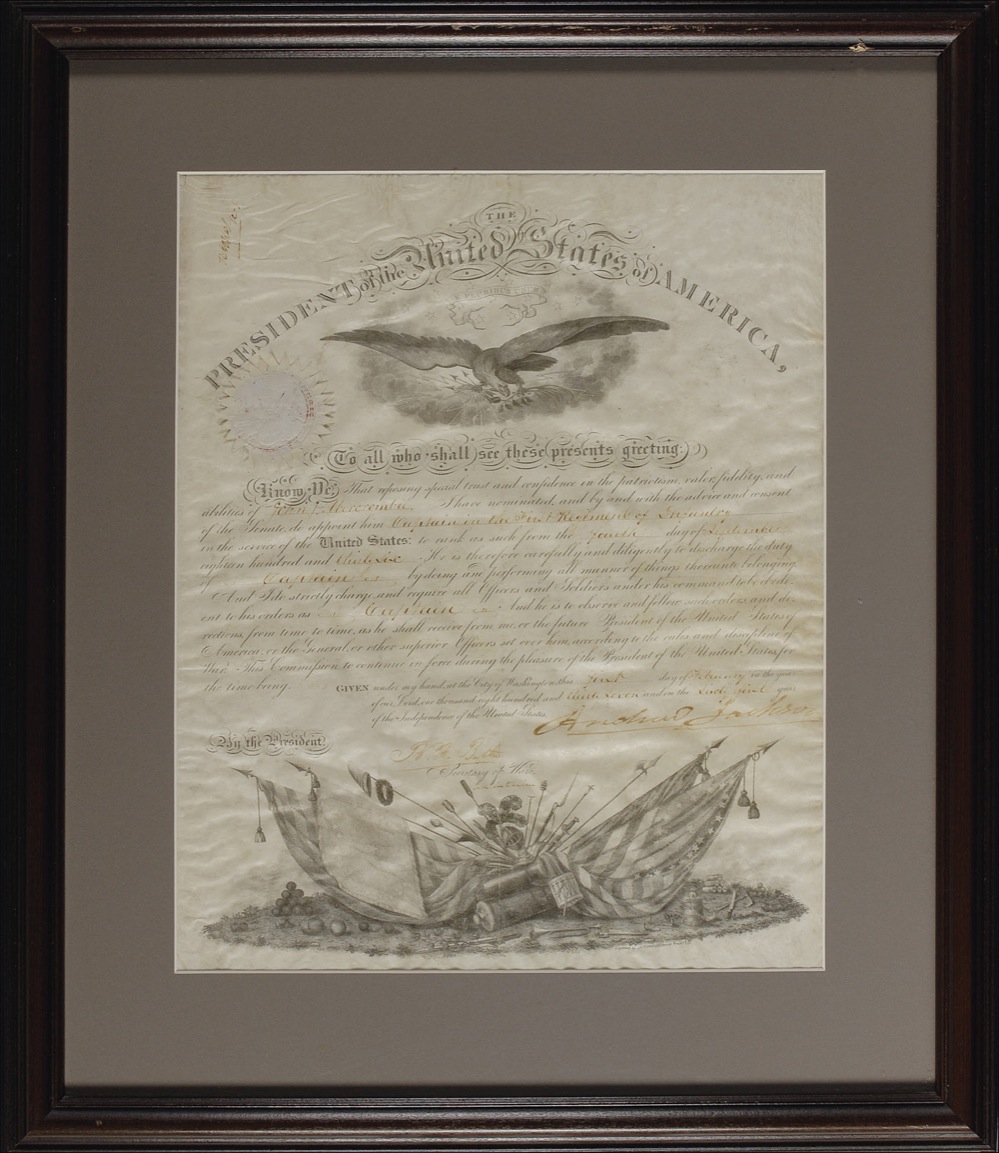 Partly-printed DS as president, one page, 13 x 16, February 1, 1837. President Jackson appoints John Abercrombie a “Captain in the First Regiment of Infantry.” Signed at the conclusion by Jackson and countersigned by Benjamin Franklin Butler, in place of the Secretary of War. Matted and framed to an overall size of 20 x 23.25. In good to very good condition, with overall rippling and wrinkling, scattered toning, and previous storage folds. Jackson’s signature measures an impressive 5.5 inches long. Pre-certified John Reznikoff/PSA/DNA and RRAuction COA.