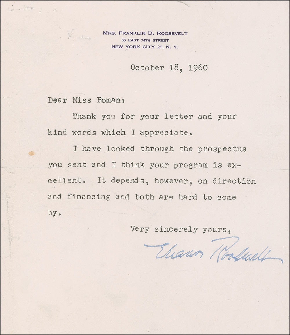 TLS, one page, 6 x 7, personal letterhead, October 18, 1960. Short letter to Audrey Boman. In full: “Thank you for your letter and your kind words which I appreciate. I have looked through the prospectus you sent and I think your program is excellent. It depends, however, on direction and financing and both are hard to come by.” Small edge tear, vertical creasing to left edge, and staple holes to top, most of which could be matted out, otherwise fine condition. Accompanied by the original mailing envelope. RRAuction COA.