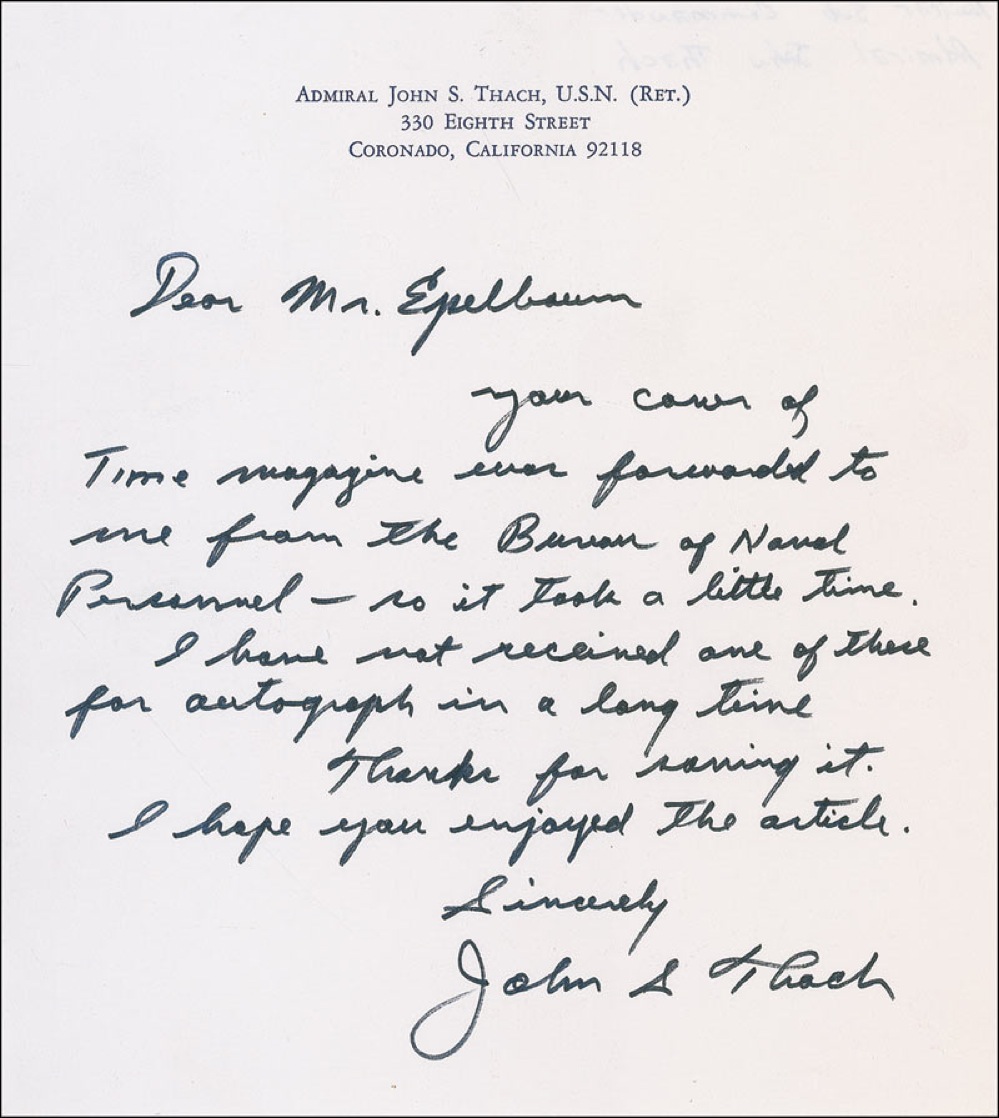 Navy aviator and later admiral (1905–1981) known for his development of the Thach Weave, a combat flight formation that could counter enemy fighters of superior performance, and later the big blue blanket, an aerial defense against Kamikaze attacks. ALS signed “John S. Thach,” one page, 6.25 x 7, personal letterhead, no date. In full: “Your cover of Time magazine was forwarded to me from the Bureau of Naval Personnel—so it took a little time. I have not received any of these for autograph in a long time. Thanks for saving it. I hope you enjoyed the article.” In fine condition, with a couple of light creases and show-through from a notation on the reverse. RRAuction COA.