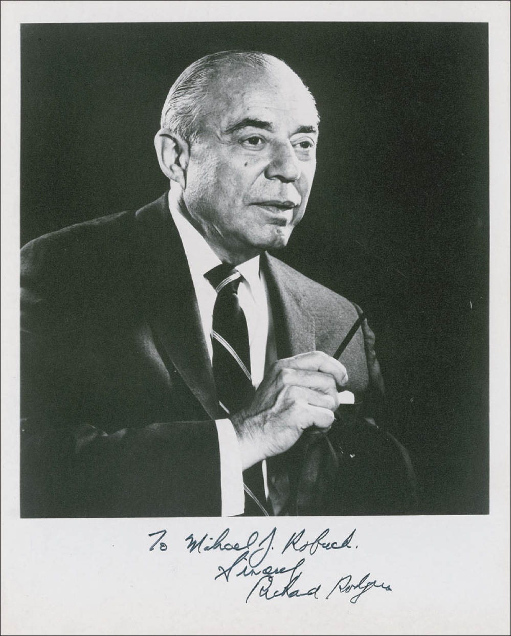 American composer (1902–1979) best known for the scores to such Broadway hits as Oklahoma, The King and I, and The Sound of Music. Matte-finish 8 x 10 photo, signed and inscribed in black felt tip “To Michael J. Robuck, Sincerely, Richard Rodgers.” Some mild rippling and toning along bottom edge, and some other light bends and ripples, otherwise fine condition. RRAuction COA.
