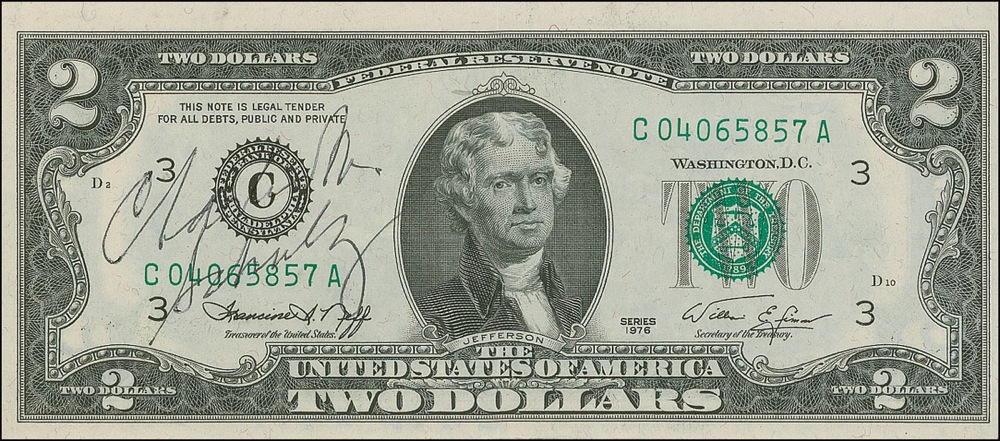 Series 1976 two dollar bill, signed on the portrait side in black ballpoiint, “Charles M. Schulz.” In fine condition, with a bit of light signature contrast. RRAuction COA.