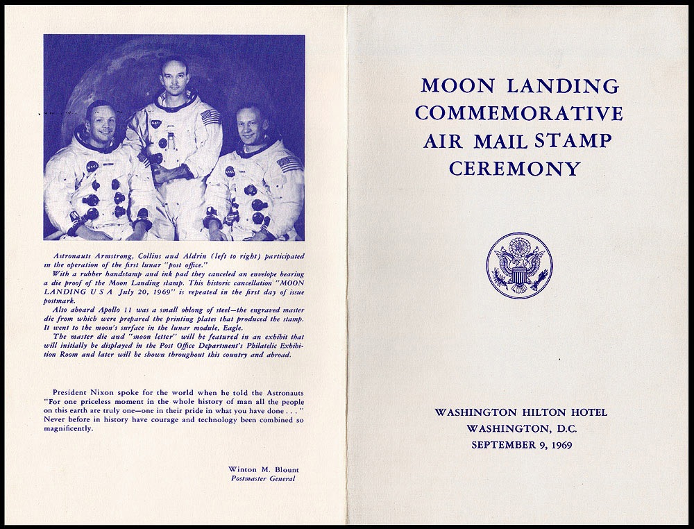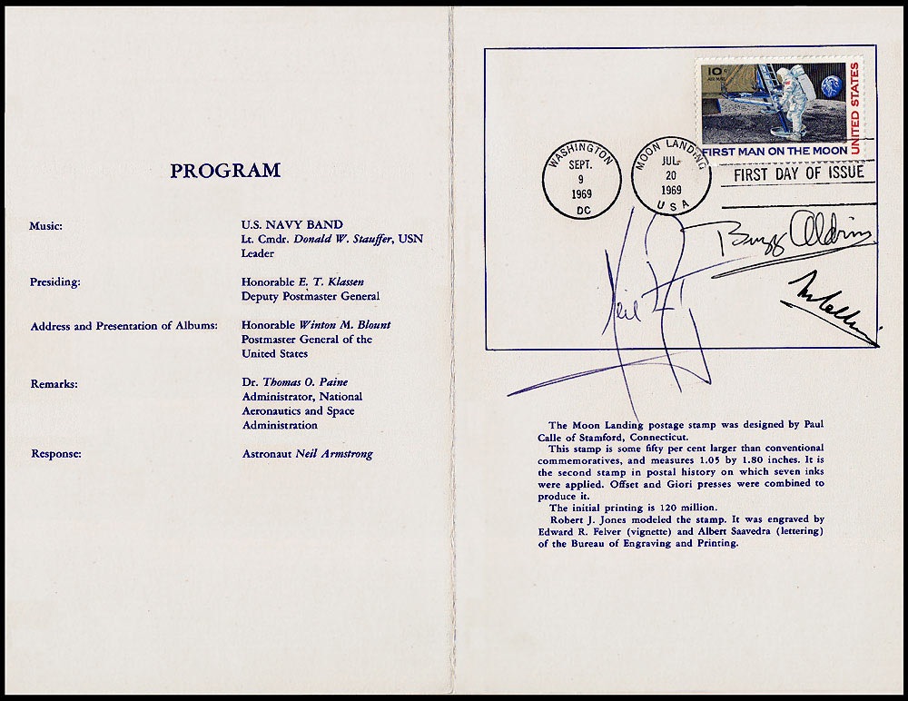 Original program, 5.25 x 8, two pages, from the Moon Landing Commemorative Air Mail Stamp ceremony held at the Washington Hilton Hotel on September 9, 1969, signed inside near the stamp, First Day of Issue stamp, and postmarks in blue ballpoint by Neil Armstrong, in black ballpoint by Buzz Aldrin, and in black ink by Michael Collins. Signature area bears a July 20, 1969, Moon landing postmark, as well as a September 9, 1969, Washington, D. C. postmark. In fine condition, with some light mirroring of postage stamp to opposite page. Accompanied by an official invitation to the ceremony, bearing the low serial number of 17. An absolutely spectacular example sure to appeal to both space and philatelic collectors. Pre-certified Scott Cornish and RRAuction COA.