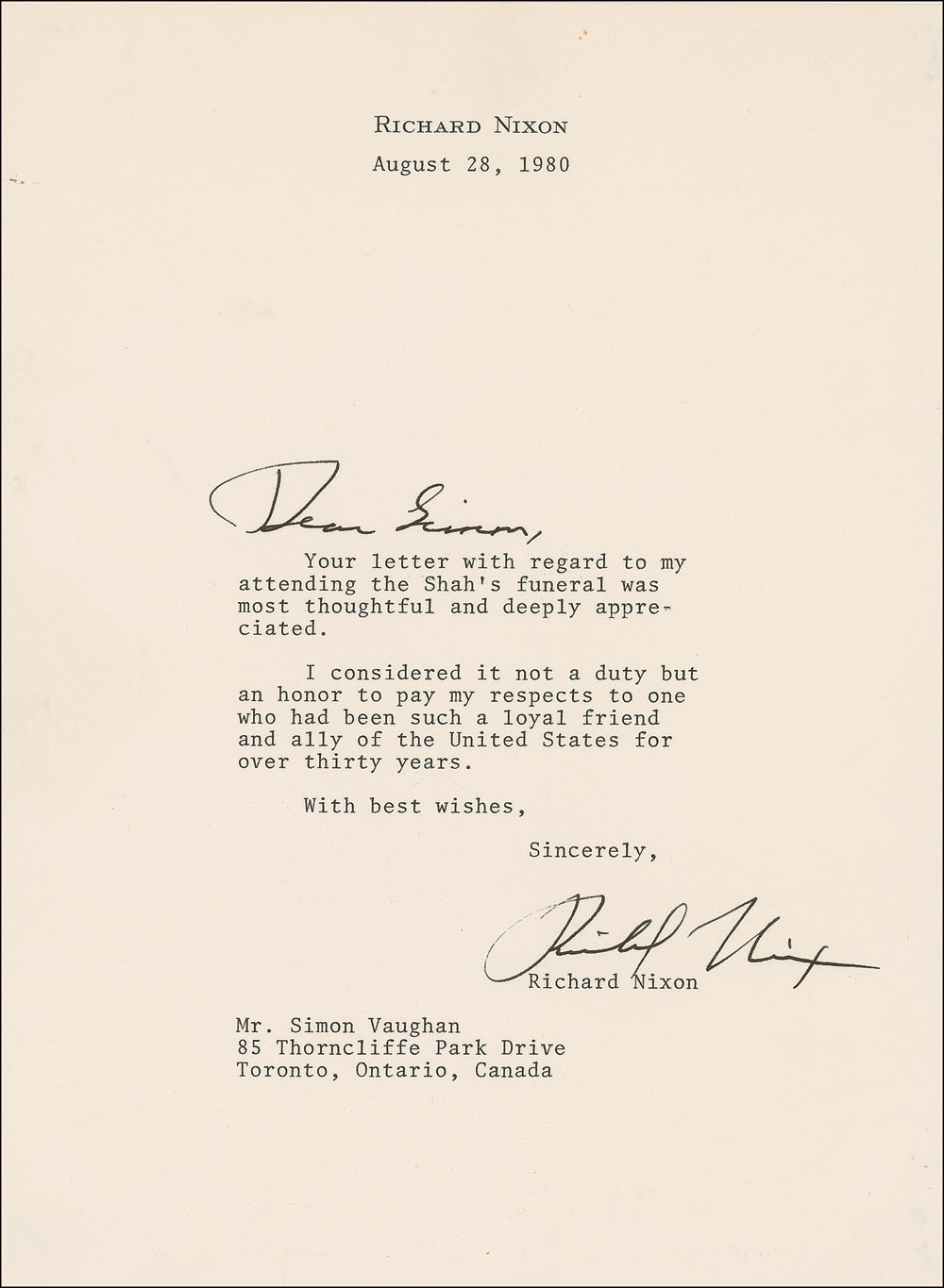 TLS, one page, 7.25 x 9.75, personal letterhead, August 28, 1980. Signed at the conclusion by Nixon who has also added a greeting at the top. Nixon writes Simon Vaughan regarding attending the funeral of the Shah of Iran. In full: “Your letter with regard to my attending the Shah’s funeral was most thoughtful and deeply appreciated. I consider it not a duty but an honor to pay my respects to one who had been such a loyal friend and ally of the United States for over thirty years.” In fine condition, with horizontal mailing folds touching his signature and greeting, and a speck of soiling at the top of the page. Accompanied by the original mailing envelope. Pre-certified John Reznikoff/PSA/DNA and RRAuction COA.