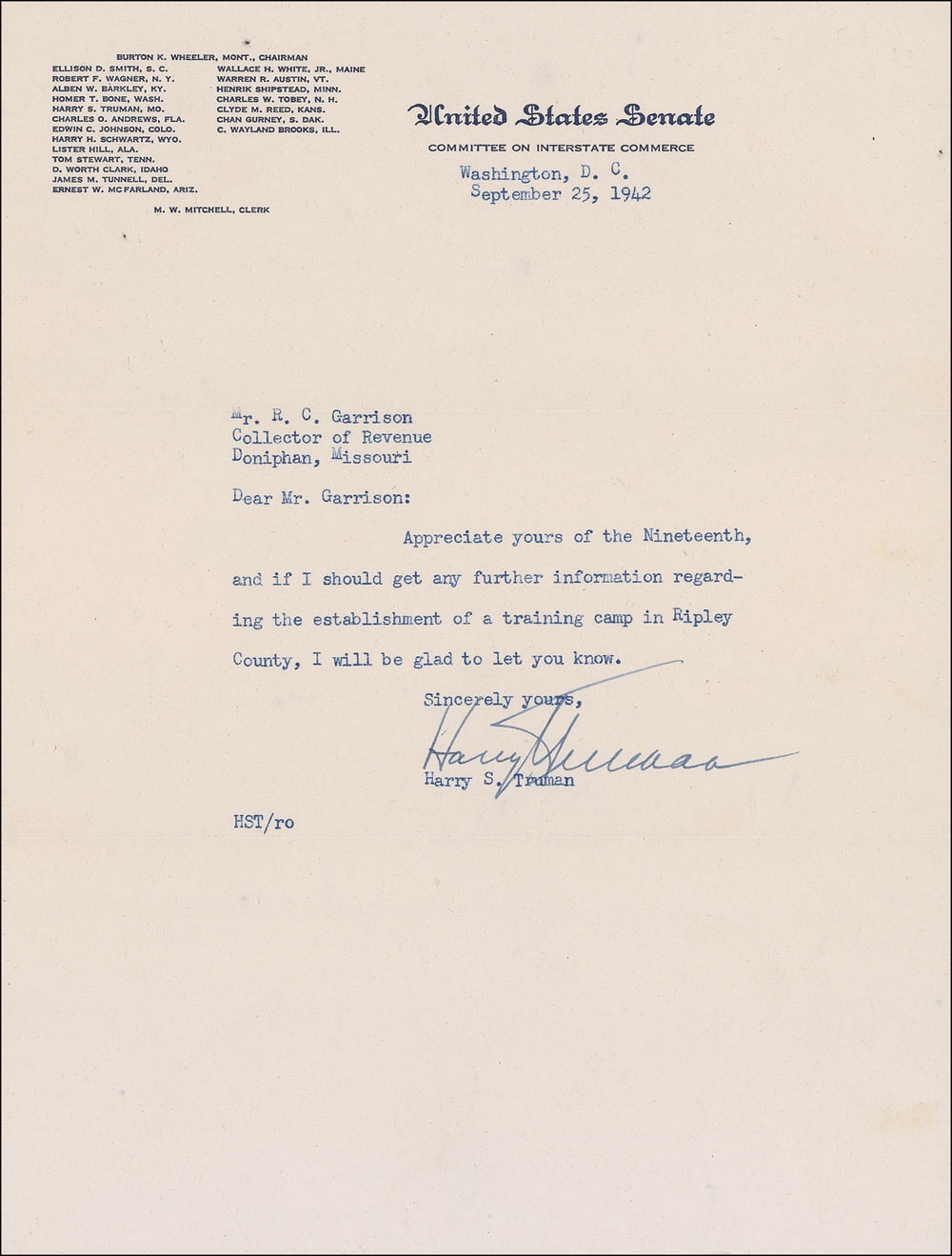 TLS, one page, 8 x 10.5, United States Senate letterhead, September 25, 1942. Truman contacts the collector of revenue in Doniphan, Missouri. In full: “Appreciate yours of the Nineteenth, and if I should get any further information regarding the establishment of a training camp in Ripley County, I will be glad to let you know.” Some creasing, scattered wrinkling, and a small spot of soiling near the bottom right corner, otherwise fine condition. Pre-certified John Reznikoff/PSA/DNA and RRAuction COA.