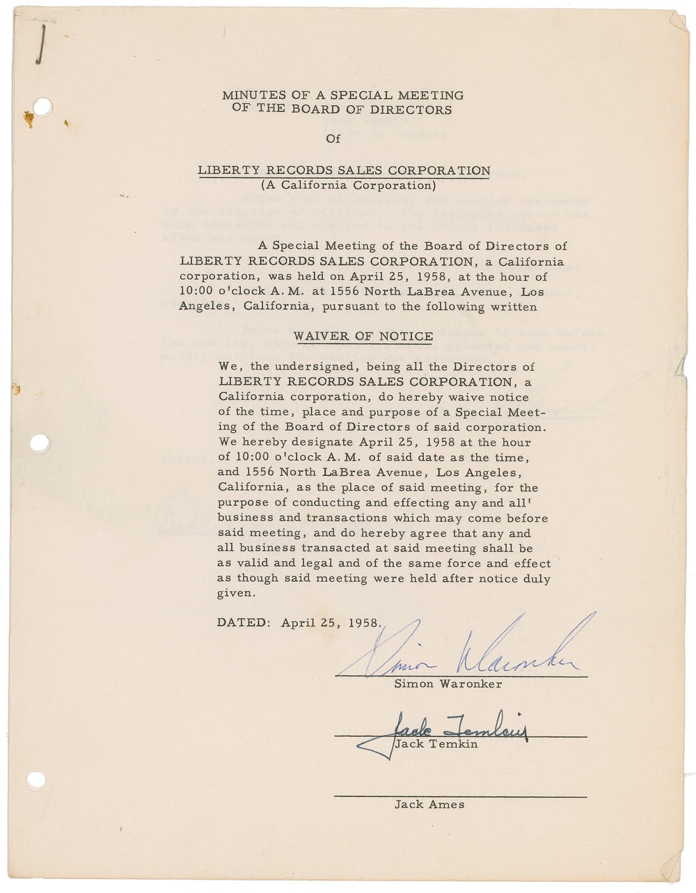 Violinist and record producer (1915–2005). Two items: TLS, one page, 8.5 x 11, dated February 28, 1958. Letter to Jack Ames terminating his employment. In part: “Be advised that your employment by this corporation has been terminated effective immediately; and you should govern yourself accordingly.”; and a two-page DS, 8.5 x 11, dated April 25, 1958, signed twice by Waronker. Minutes of a Special meeting of the Board of Directors of Liberty Records Sales Corporation electing officers. In very good condition, with light creasing to both, and staple, punch holes, and toning to document. RRAuction COA.