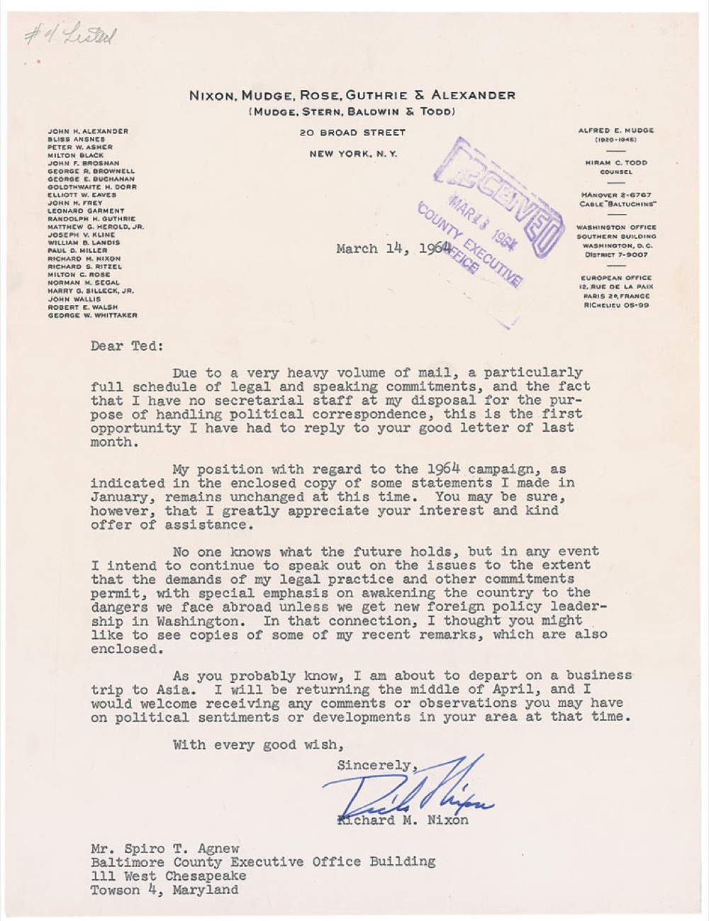 TLS signed “Dick Nixon,” one page, 8.5 x 11, Nixon, Mudge, Rose, Guthrie & Alexander letterhead, March 14, 1964. Nixon writes Balitmore County Executive Spiro T. Agnew. In full: “Due to a very heavy volume of mail, a particularly full schedule of legal and speaking commitments, and the fact that I have no secretarial staff at my disposal for the purpose of handling political correspondence, this is the first opportunity I have had to reply to your good letter of last month. My position with regard to the 1964 campaign, as indicated in the enclosed copy of the some statements I made in January, remains unchanged at this time. You may be sure, however, that I greatly appreciated your interest and kind offer of assistance.