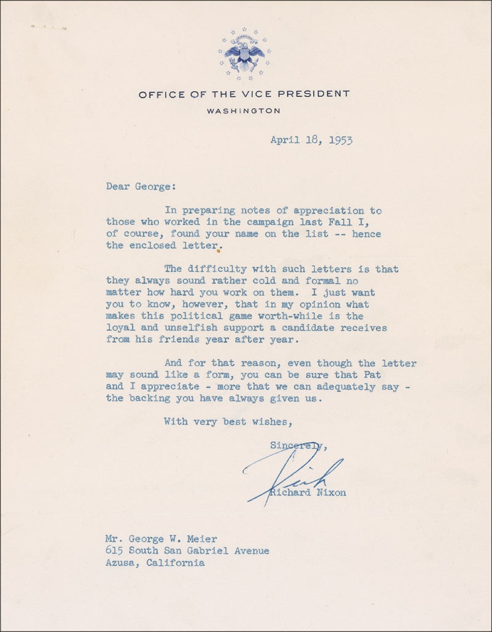 TLS signed “Dick,” one page, 7 x 9, Office of the Vice President letterhead, April 18, 1953. Letter of thanks to a campaign worker. In part: “In preparing notes of appreciation to those who worked in the campaign last Fall I, of course, found your name on the list––hence the enclosed letter. The difficulty with such letters is that they always sound rather cold and formal no matter how hard you work on them. I just want you to know, however, that in my opinion what makes this political game worth while is the loyal and unselfish support a candidate receives from his friends year after year.” In fine condition, with staple hole to top left and a couple light wrinkles. Pre-certified John Reznikoff/PSA/DNA and RR Auction COA.