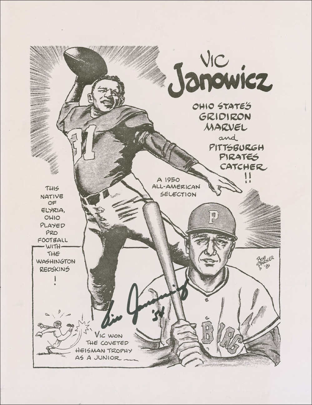 Halfback for the Washington Redskins who played college football at Ohio State University and won the Heisman Trophy in 1950. During training camp in 1956, he suffered a serious brain injury in an automobile accident that left him partially paralyzed and ended his athletic career. Composite print, 8.5 x 11, of a cartoon of Janowicz by Bob Parker in 1981, signed in black felt tip. In fine condition. Pre-certified Steve Grad/PSA/DNA and RRAuction COA.