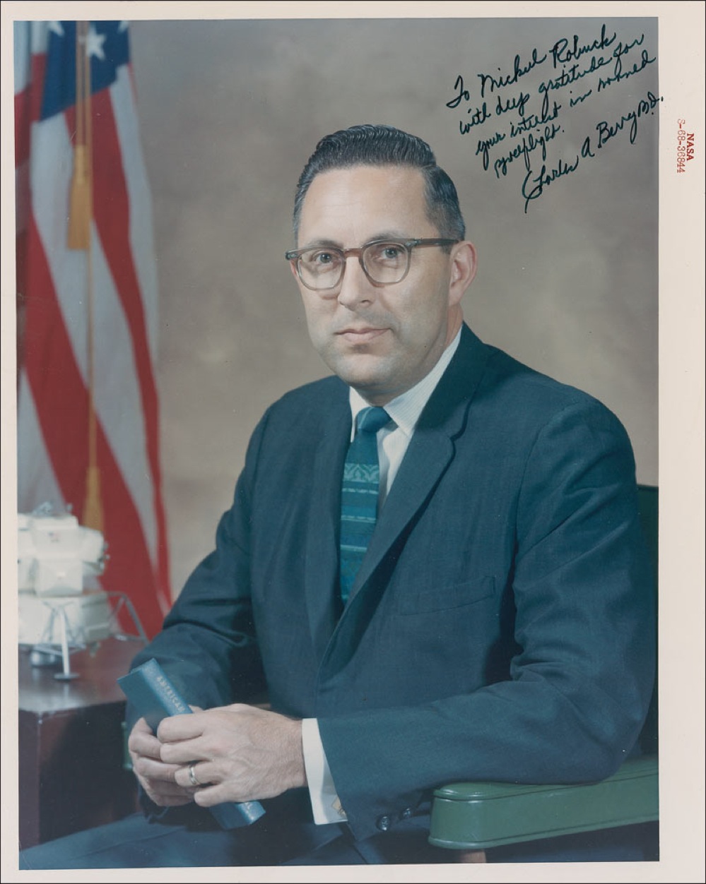 Former NASA Chief Medical Officer. Color glossy 8 x 10 NASA ‘red-numbered’ photo, signed and inscribed in black felt tip “To Michael Robuck, with deep gratitude for your interest in manned spaceflight, Charles A. Berry, m.d.” In fine condition. Pre-certified Scott Cornish and RRAuction COA.