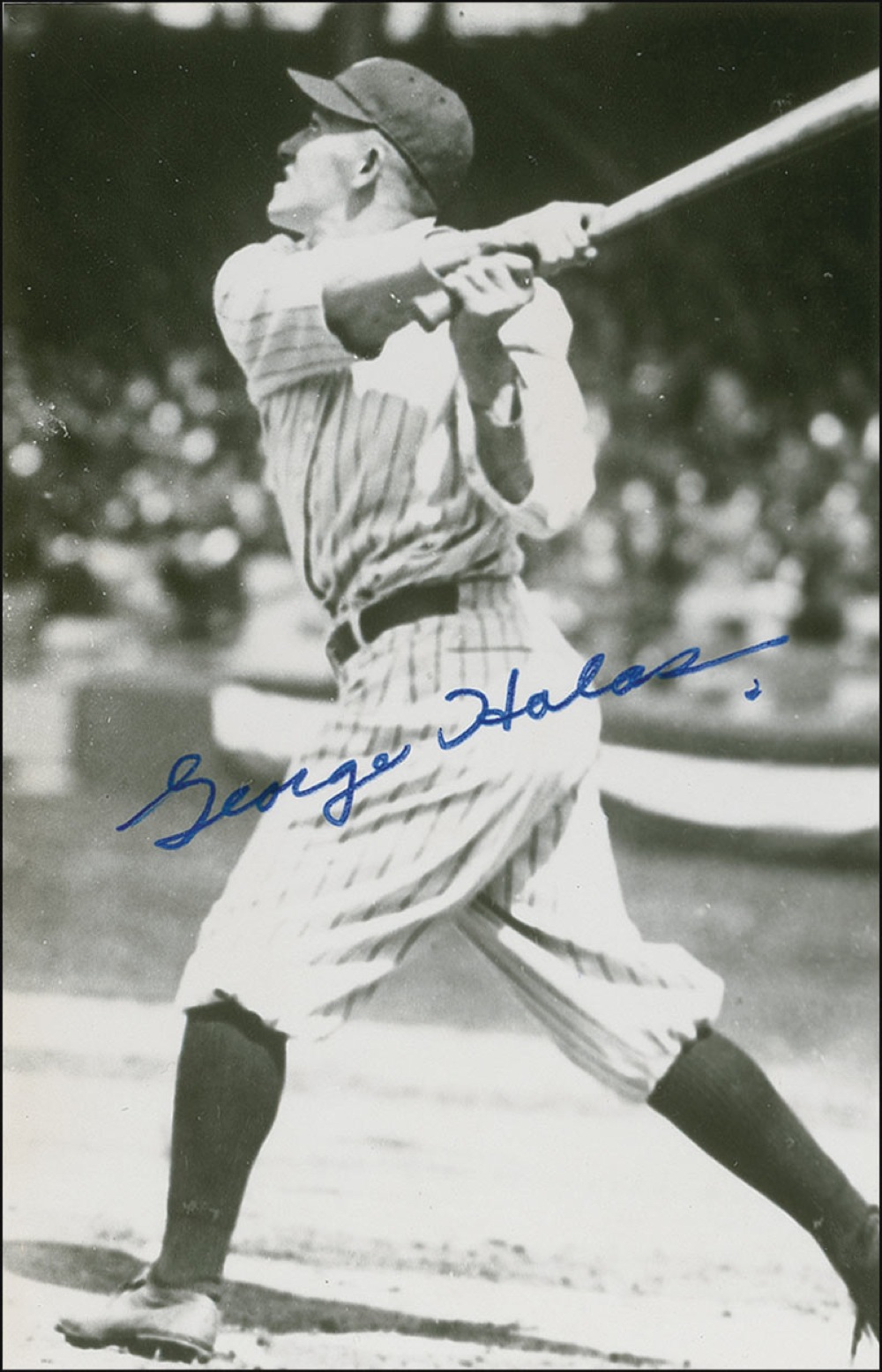 Unusual 3.5 x 5.5 postcard photo of Halas at bat for the New York Yankees, signed in blue felt tip. In fine condition. Halas played 12 games as an outfielder for the Yankees in 1919. However, a hip injury effectively ended his baseball career. Pre-certified Steve Grad/PSA/DNA and RRAuction COA.