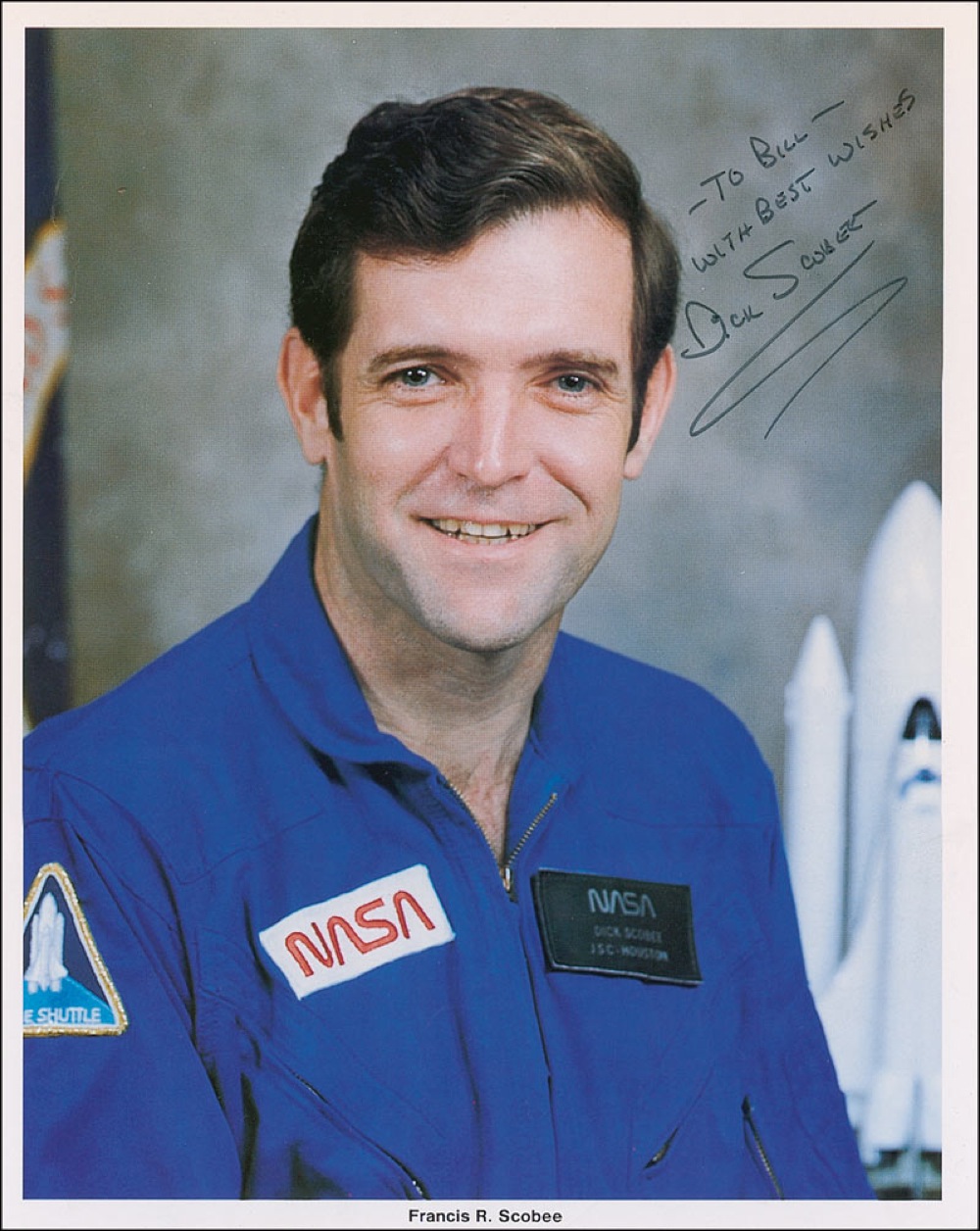 NASA astronaut who perished aboard the ill-fated mission in 1986. Color 8 x 10 NASA photo, signed and inscribed in black felt tip “– To Bill – With best wishes, Dick Scobee.” In fine condition, with a couple of light surface creases. Pre-certified Scott Cornish and RRAuction COA.