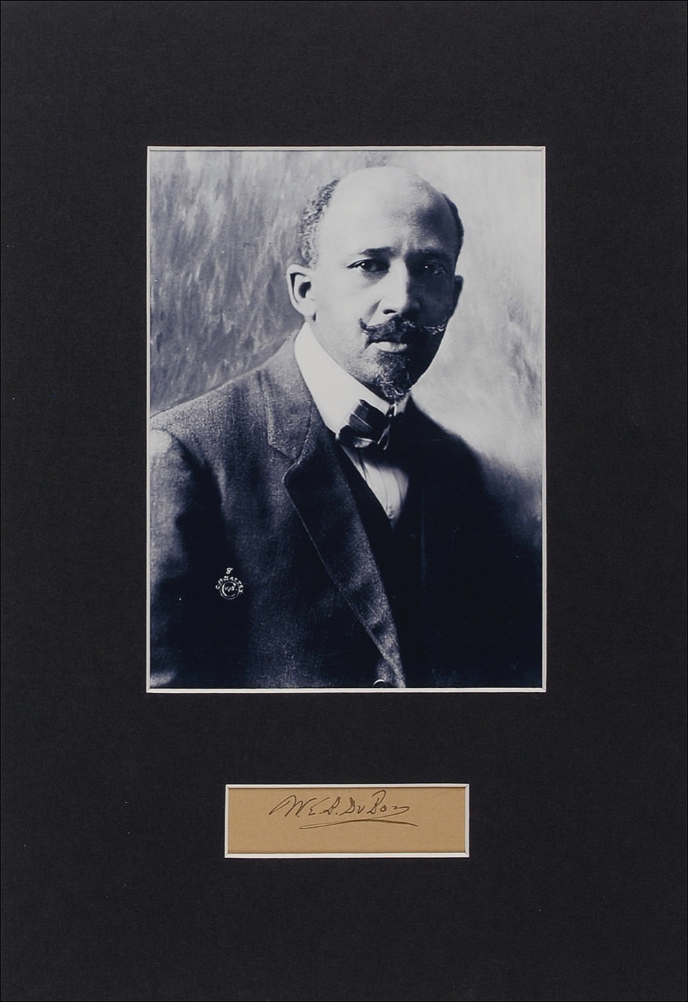 Influential black writer and educator who helped transform the prevailing view of his people’s role in America. Scarce vintage ink signature, “W. E. B. DuBois,” on an off-white slip. Matted with a portrait of DuBois, to an overall size of 9 x 13. In fine condition, with uniform toning. Pre-certified PSA/DNA and RRAuction COA.