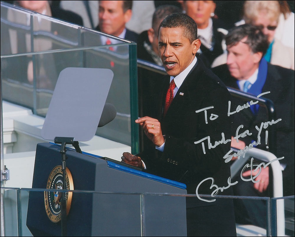 Color glossy 10 x 8 photo, signed and inscribed in silver ink as president, “To Laura – Thanks for your support! Barack Obama.” In fine condition. Signature was originally acquired at a Caterpillar plant in Peoria, Illinois, in February 2009, and is accompanied by a letter of provenance detailing the story, two candid snapshots of the presidential motorcade en route to the plant, and a candid laser print photo of Obama delivering his speech. Pre-certified PSA/DNA and RRAuction COA.