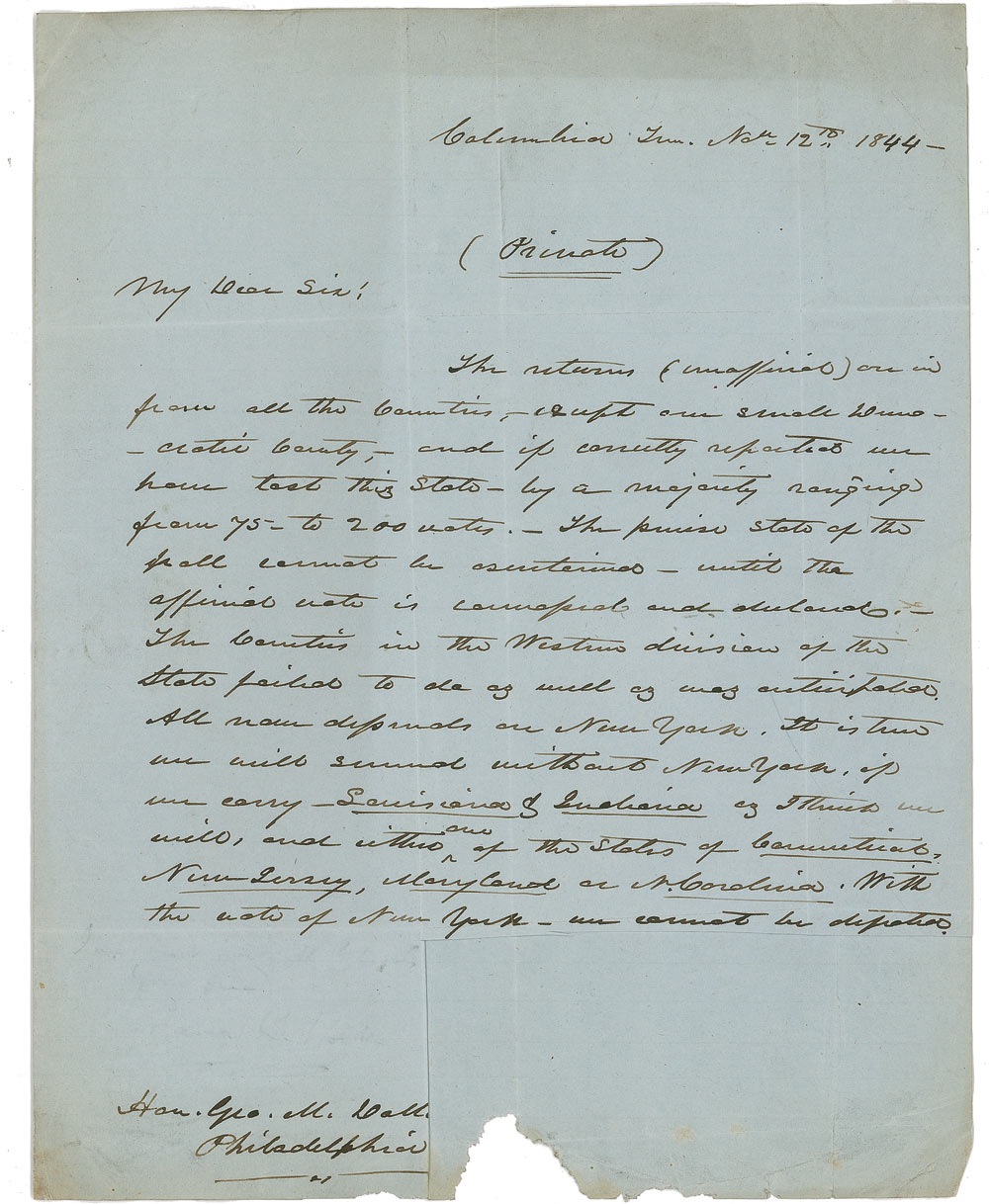 After losing his home state in the election of 1844, Polk discusses a path to victory with his Vice Presidential running mate days after the election "With the vote of New York - we cannot be defeated