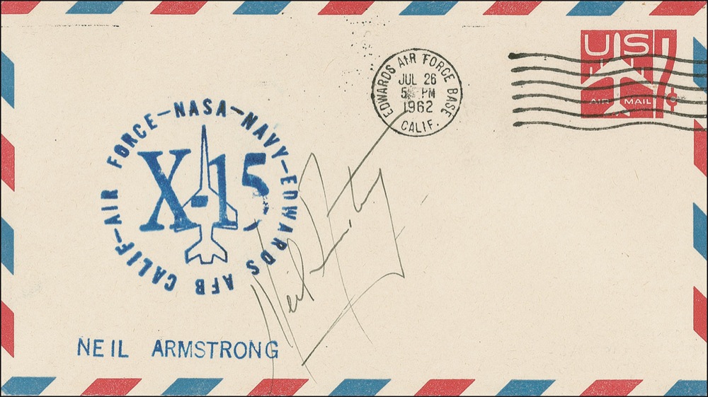 Rare vintage commemorative cover with a stamped cachet honoring the X-15 program, signed in black ink by Armstrong circa 1962. Cover also bears a July 26, 1962, Edwards Air Force Base postmark, the date of Armstrong’s X-15 flight. In fine condition, with a couple light bends and trivial pencil remnants from an erased address to lower right. On this flight, Armstrong’s speed reached 3989 mph. An early memento from a pilot who went on to much bigger things. Pre-certified Scott Cornish and RRAuction COA.