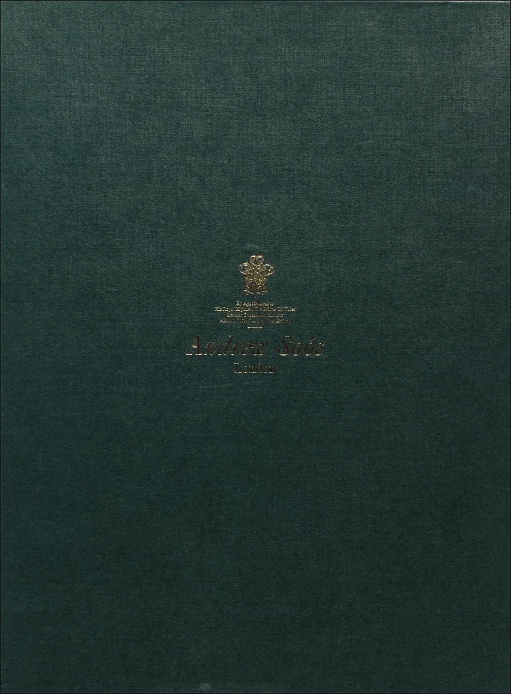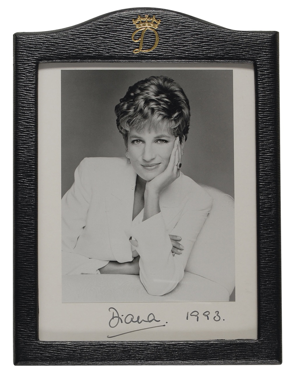 Simply stunning satin-finish 6 x 8 photo of Diana resting her head in her hand, affixed to its original 7.5 x 9.5 mount, signed on the mount in black ink, “Diana 1993.” Photo is housed in its handsome original black leather frame with Diana’s crest and arched top measuring 9.25 x 12.5 overall. In fine condition. Also accompanied by the original green Andrew Soos box, which is gilt-stamped on the front, “By appointment to His Royal Highness The Prince of Wales, Leather Goods Manufacturer, Andrew Soos, T/A Benedeck Limited London.” A more beautiful presentation would be hard to find! Pre-certified John Reznikoff/PSA/DNA and RRAuction COA.