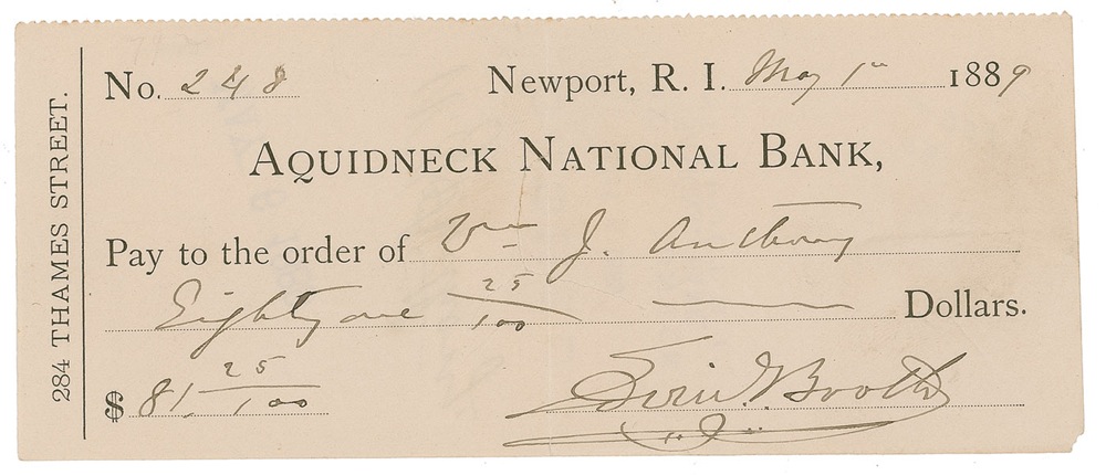 Renowned American Shakespearean actor (1833–1893) and brother of Lincoln assassin John Wilkes Booth. Bank check, 6.5 x 2.75, filled out and signed by Booth, payable to Wm. J. Anthony for $81.25, May 1, 1889. A central vertical fold, a bit of light soiling, and a couple light creases, otherwise fine condition. Pre-certified PSA/DNA and RRAuction COA.