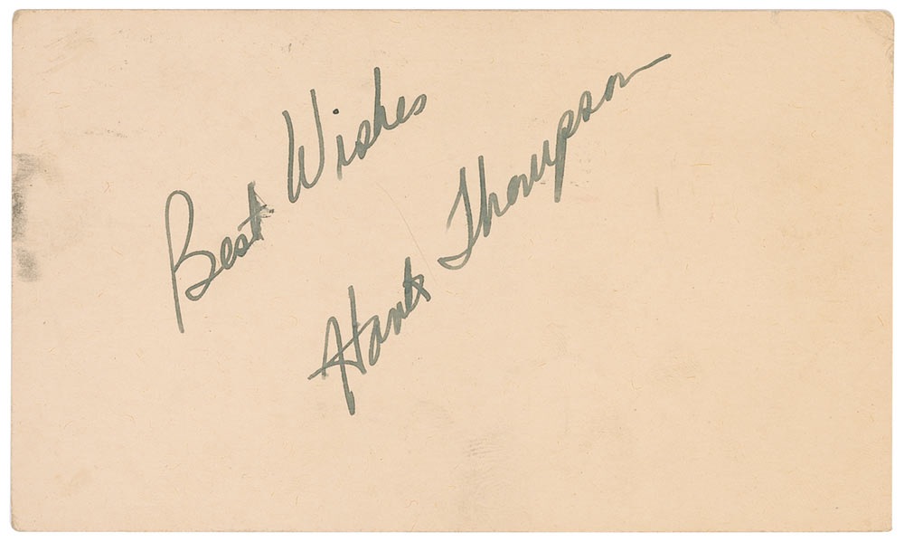 Former Major League third basemen (1925–1969) and the first African-American to play in both the National and American League. Vintage fountain pen signature, “Best wishes, Hank Thompson,” on an off-white 5.5 x 3.25 government postcard (postmarked 8/28/53). In fine condition, with some scattered light soiling and some light corner creases. Pre-certified Steve Grad/PSA/DNA and RRAuction COA.