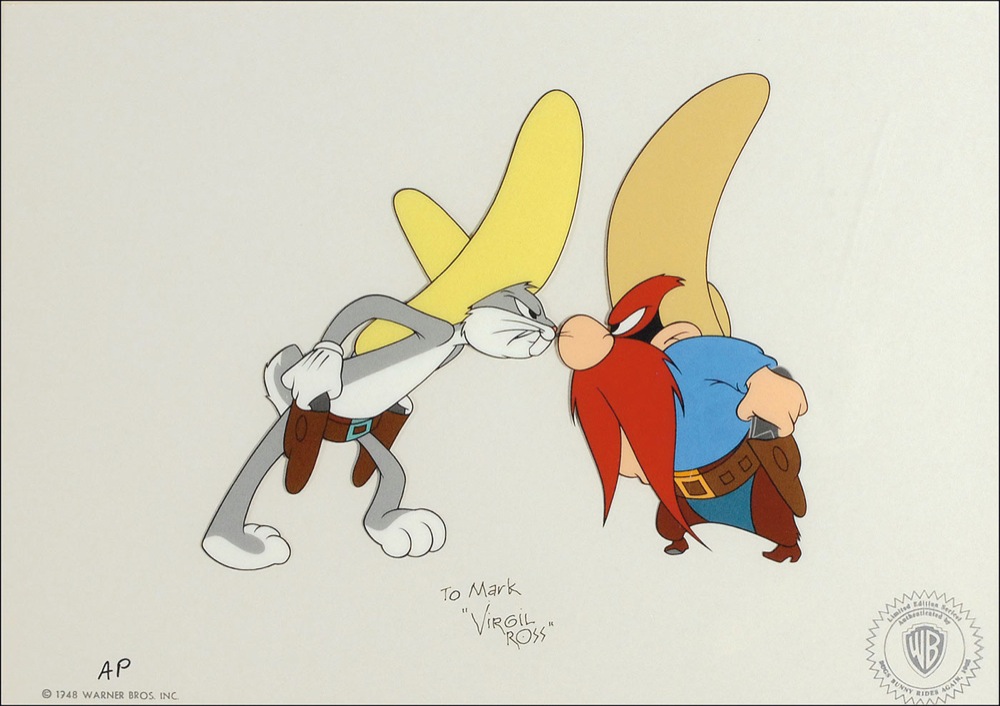 Limited edition artists color sericel entitled ‘Bugs Bunny Rides Again,’ 13.25 x 9.5, #AP/250, showing Bugs Bunny squaring off against Yosemite Sam, signed and inscribed in black ink, “To Mark, ‘Virgil Ross.’” Double matted to an overall size of 20 x 16. In very fine condition. RRAuction COA.