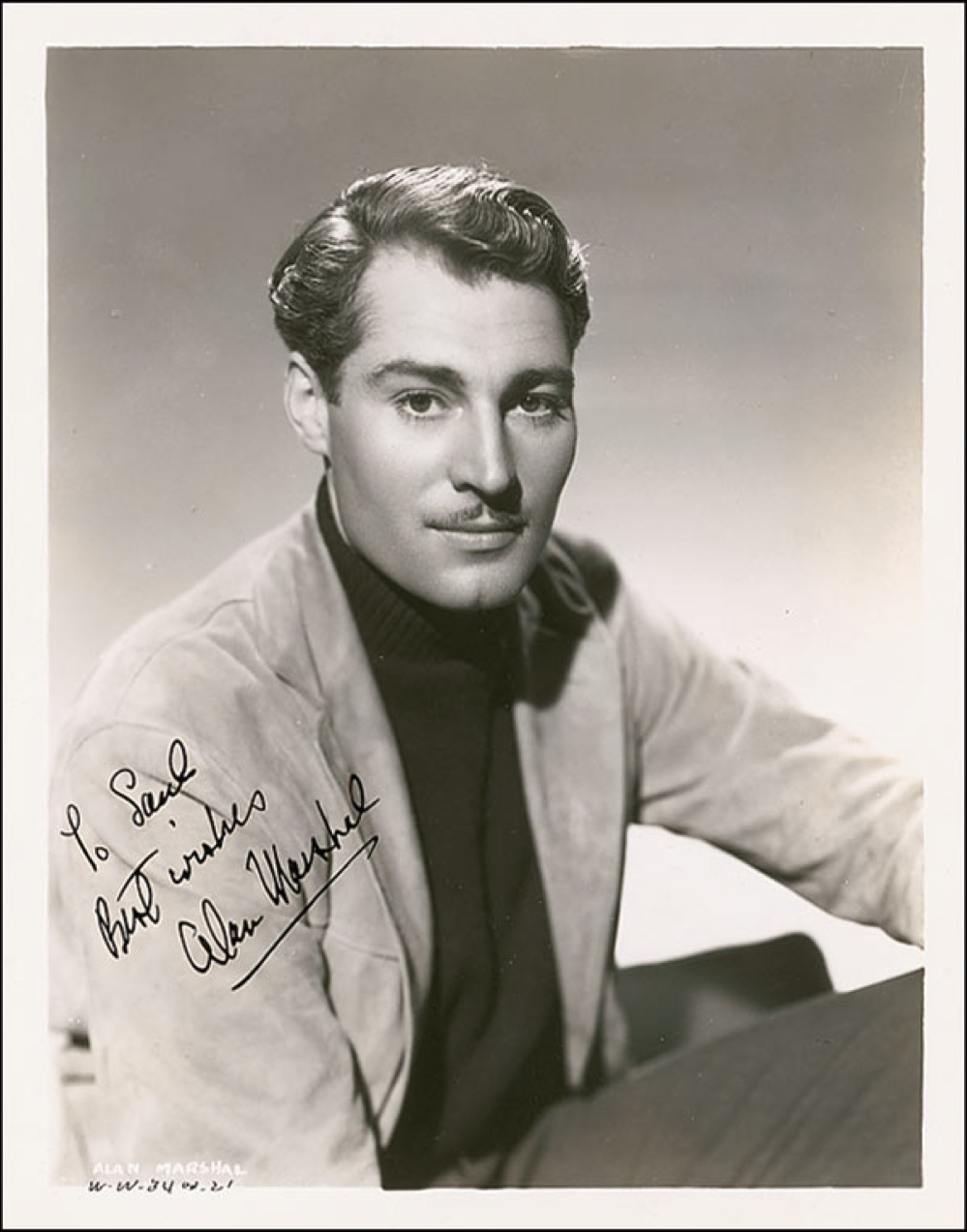 Australian-born actor (1909–1961) who appeared in such films as The Hunchback of Notre Dame and The Adventures of Sherlock Holmes. He died from a heart attack while appearing in Chicago with Mae West in a production of her play Sextette. Vintage glossy 8 x 10 photo, signed and inscribed in-person in fountain pen “To Saul, Best wishes, Alan Marshal.” Reverse of photo bears collector’s stamp date of September 15, 1937, the date the signature was acquired. In fine condition, with a few scattered light surface marks and dings and a bit of light discoloration to background. Pre-certified PSA/DNA and RRAuction COA.