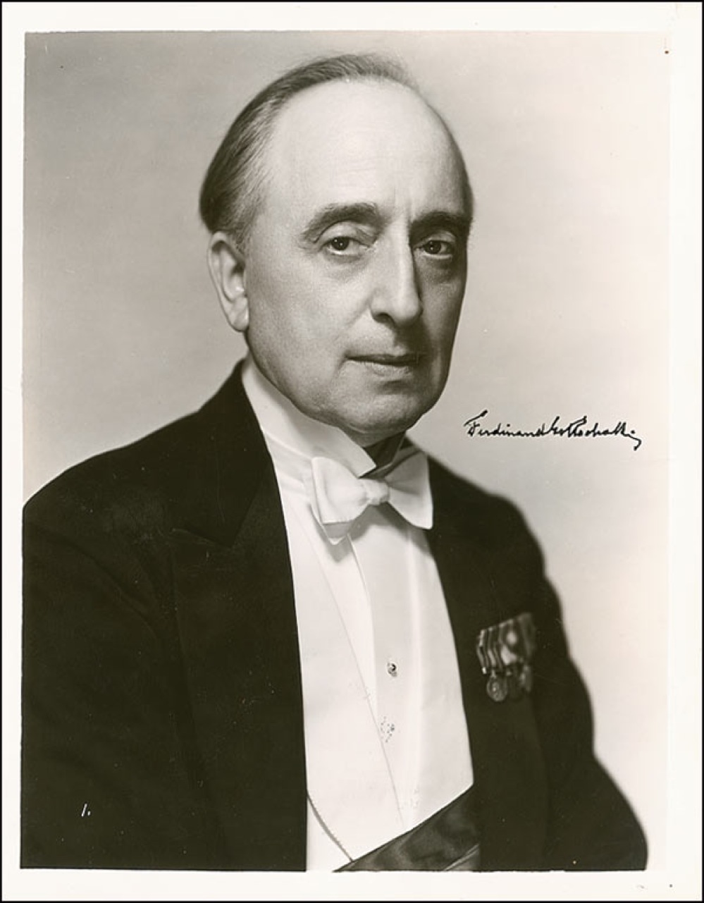 Vintage glossy 8 x 10 Universal publicity photo of the actor in a tuxedo adorned with medals, signed in-person in fountain pen. Reverse of photo bears collector’s stamp date of November 2, 1935, the date the signature was acquired. Printed information on reverse states the actor is appearing in Bombay Mail. In fine condition, with a few scattered surface dings. Pre-certified PSA/DNA and RRAuction COA.