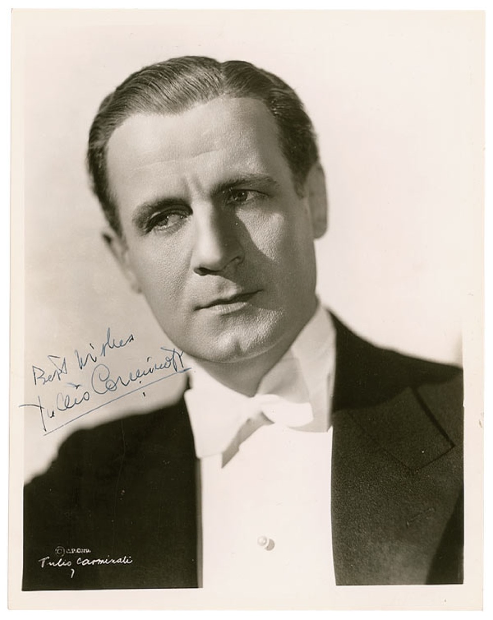 Vintage glossy 8 x 10 photo of the actor in a white tie and tuxedo, signed in-person in fountain pen. Reverse of photo bears collector’s ink date notation of September 1934, the date the signature was acquired. In very good condition, with scattered creases, surface marks and scratches. Pre-certified PSA/DNA and RRAuction COA.