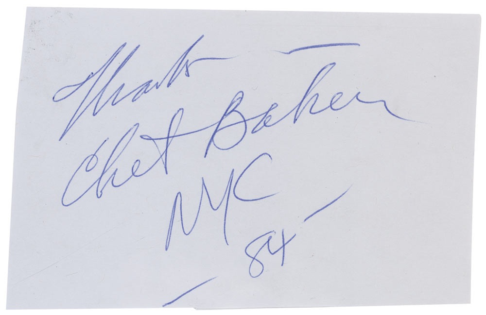 Ballpoint signature, “Thanks–Chet Baker, NYC –84–,” on a light gray 5 x 3 album page. In fine condition, with lightly trimmed edges and a few light wrinkles. Pre-certified Roger Epperson/REAL and RRAuction COA.