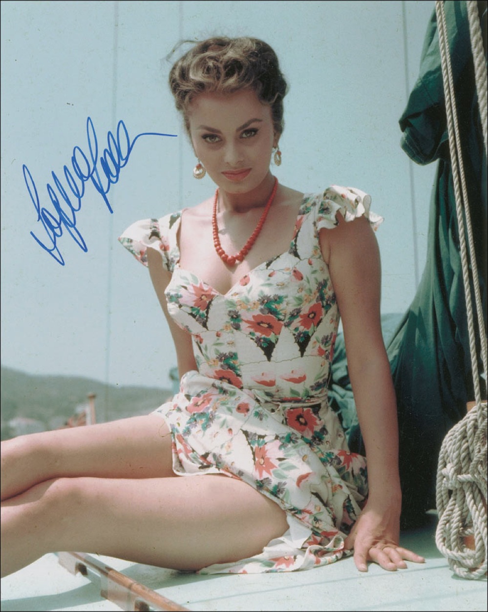 Stunning color satin-finish 8 x 10 photo of Loren on a boat and attempting to get some sun on her legs, signed in blue felt tip. In very fine condition. Pre-certified PSA/DNA and RRAuction COA.