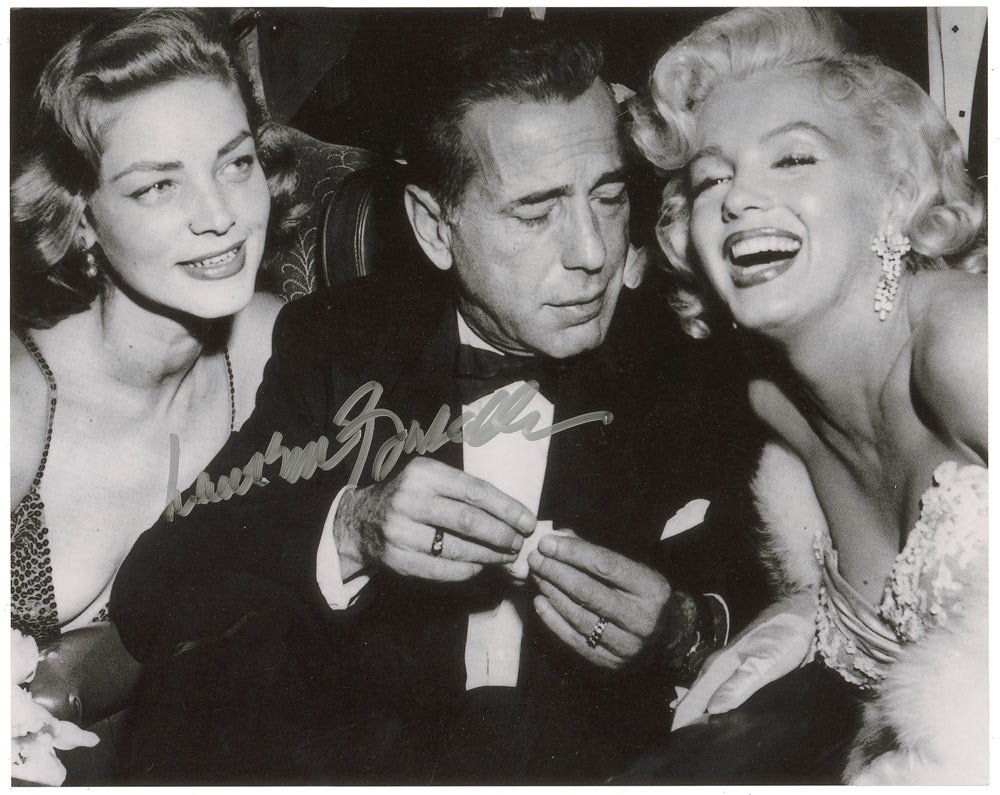 Satin-finish 10 x 8 photo of Humphrey Bogart sneaking a peek at Marilyn Monroe’s cleavage, right under the nose of Lauren Bacall, signed in silver ink by Bacall. In fine condition. Pre-certified PSA/DNA and RRAuction COA.