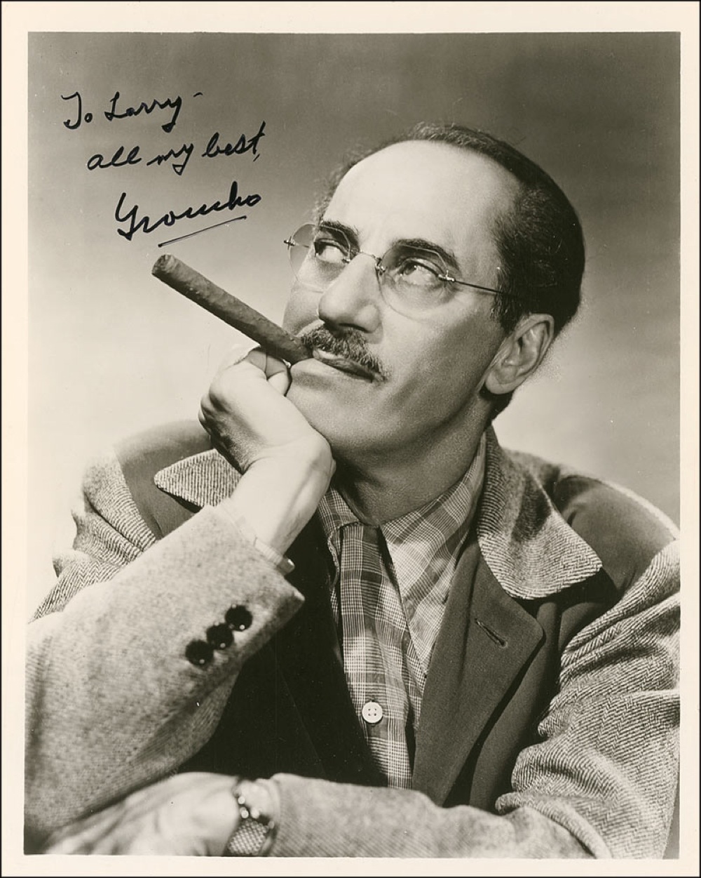 Glossy 8 x 10 photo of Groucho with a cigar clenched in his teeth, signed and inscribed in black felt tip “To Larry–all my best, Groucho.” In fine condition, with a few edge dings and corner tip creases, and some mild vertical streaking to emulsion. Pre-certified PSA/DNA and RRAuction COA.