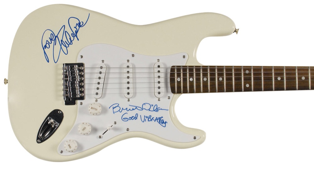 Cream colored Fender Squier Stratocaster electric guitar, signed in blue felt tip on the pickguard by Brian Wilson, adding “Good Vibrations;” and by Mike Love on the body. In fine condition. Accompanied by a photo of Love with the guitar after signing. Oversized. Pre-certified Roger Epperson/REAL and RRAuction COA.