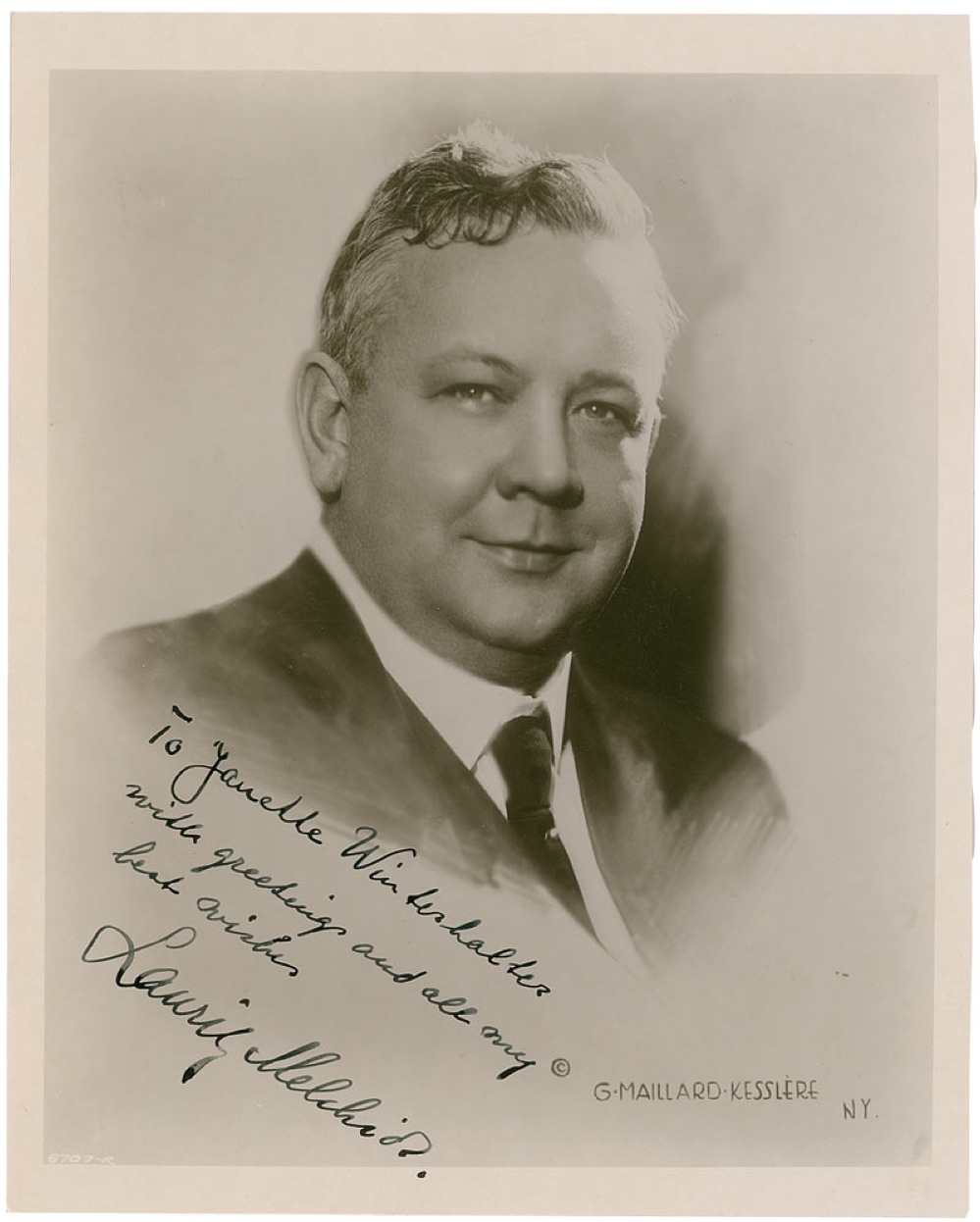 Danish-born opera singer (1890–1973) who became the premier Wagnerian tenor of the early 20th century. Vintage 8 x 10 double weight photo of an artist’s portrait of Melchior, signed and inscribed in fountain pen “To Janette Winderhalter, with greetings and all my best wishes, Lauritz Melchior.” In fine condition, with mild rippling to vertical edges. RRAuction COA.