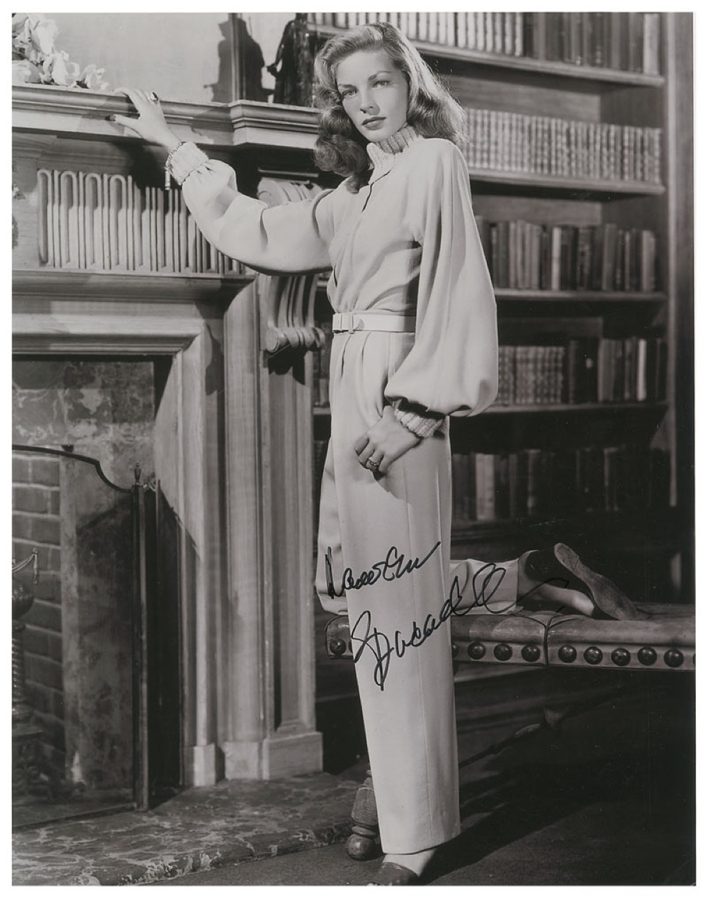 Glossy 11 x 14 full-length photo of Bacall standing next to a fireplace, signed in black felt tip. In very fine condition. Pre-certified PSA/DNA and RRAuction COA.