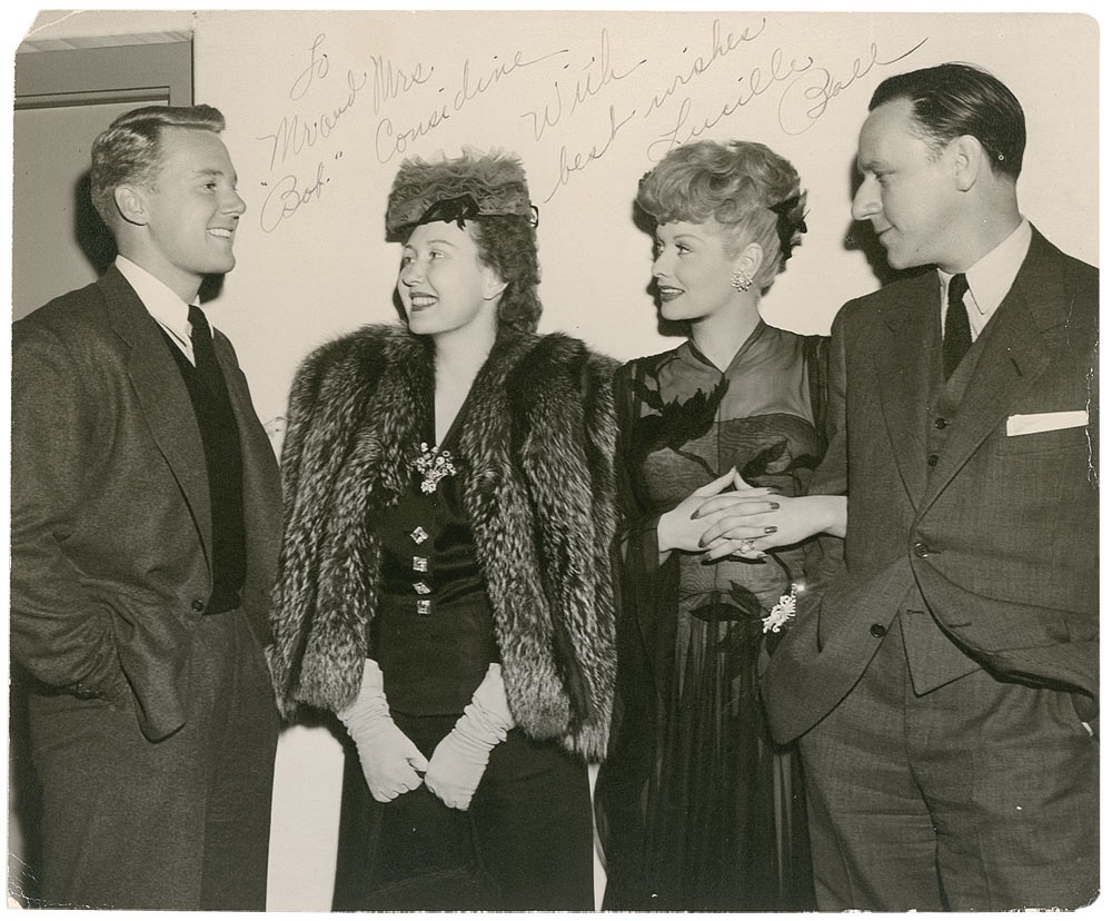 Vintage matte-finish 11.5 x 9.5 photo of Ball, writer Bob Considine, and two others, signed and inscribed in fountain pen “To Mr. and Mrs. ‘Bob’ Considine with best wishes, Lucile Ball.” In fine condition, with scattered creasing, edge wear, and a tiny tear to the upper left corner. Accompanied by a full letter of authenticity from PSA/DNA. RRAuction COA.