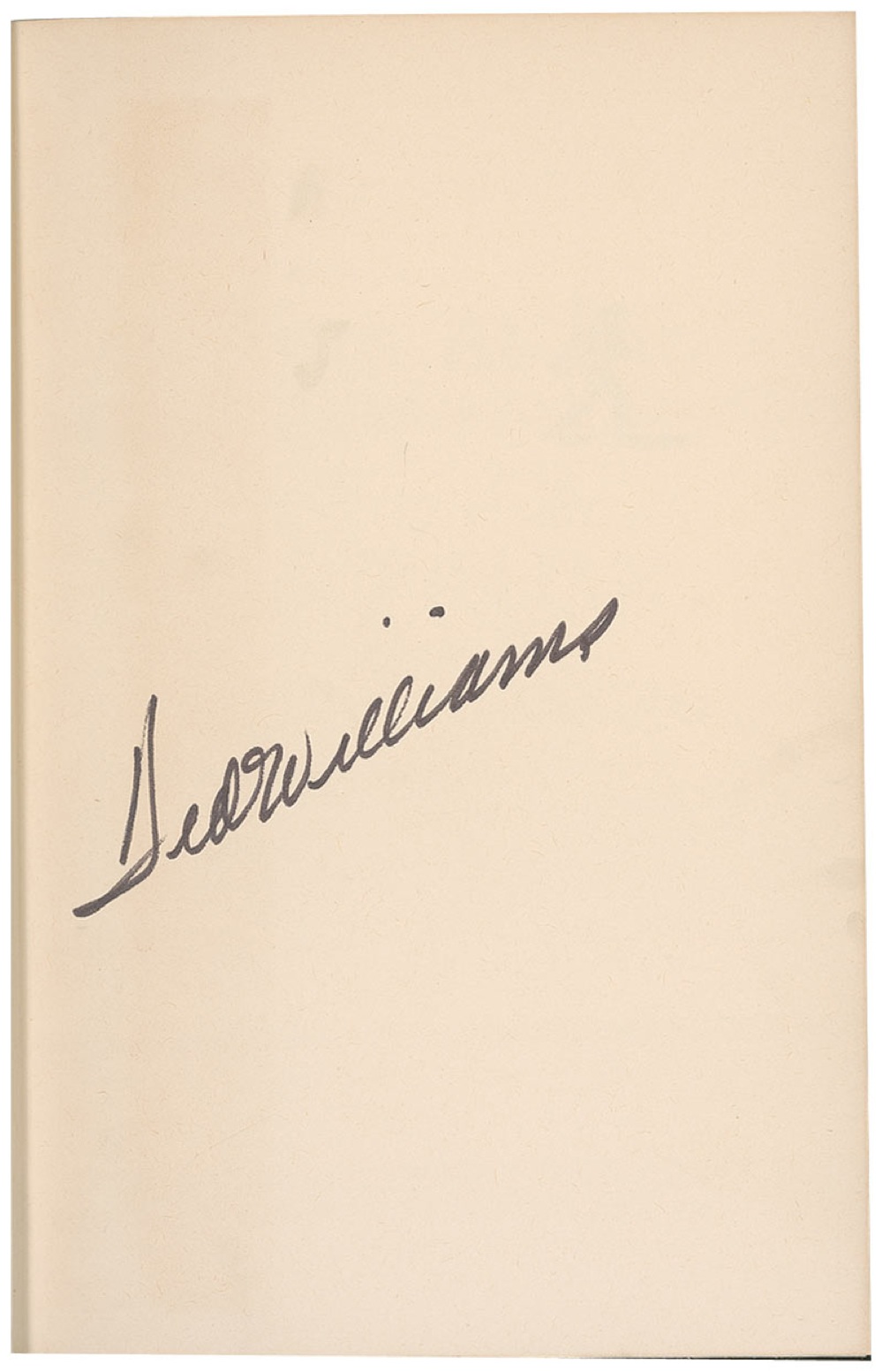 Two items: signed book, My Turn at Bat, later printing. NY: Simon and Schuster, 1969. Hardcover with dustjacket, 5.75 x 8.75. Signed in black felt tip on the first free end page “Ted Williams”; and a Ted Williams model baseball signed in black felt tip on the sweet spot by Williams. In overall very good to fine condition, with uniform toning to the signed page, mild toning to the dustjacket, heavier at the spine with a small tear, and moderate soiling to the ball. RRAuction COA.