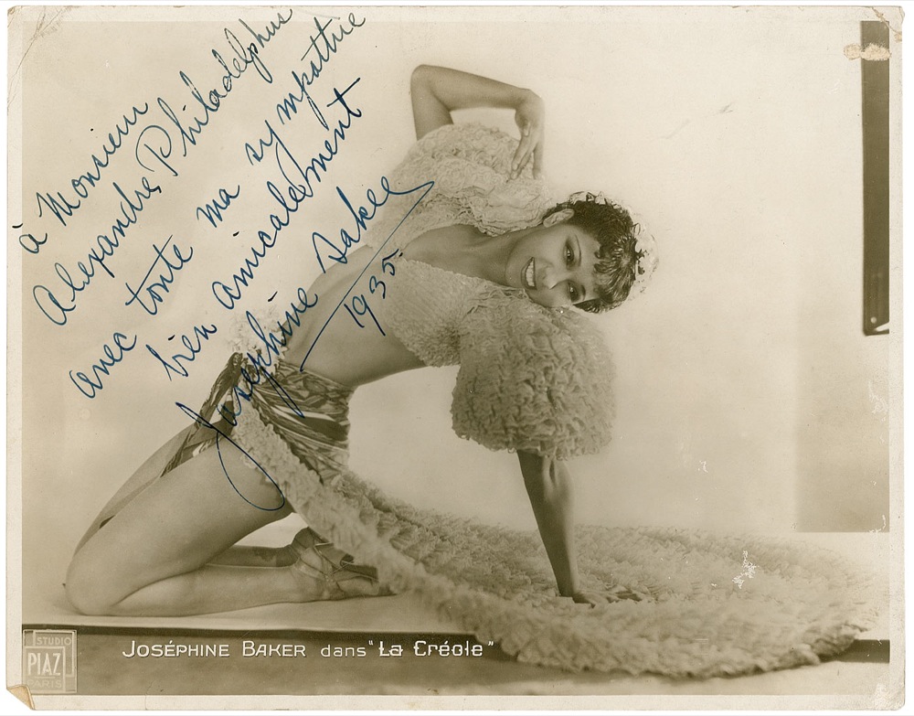 African-American expatriate singer and dancer (1906–1975), nicknamed the ‘Black Venus,’ who became one of the greatest sensations of Jazz-Age Paris. Vintage glossy 10.75 x 8.5 publicity photo of Baker in La Creole, signed and inscribed in fountain pen in French to Alexander Philadelphus, “Josephine Baker 1935.” In very good condition, with creasing, a couple vertical bends and surface marks, tiny tear at the bottom border, paper loss near the top right corner, and silvering to the darker areas. An incredible image of the gorgeous entertainer. Pre-certified PSA/DNA and RRAuction COA.