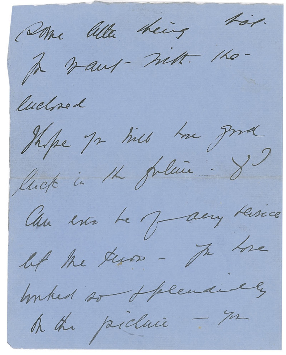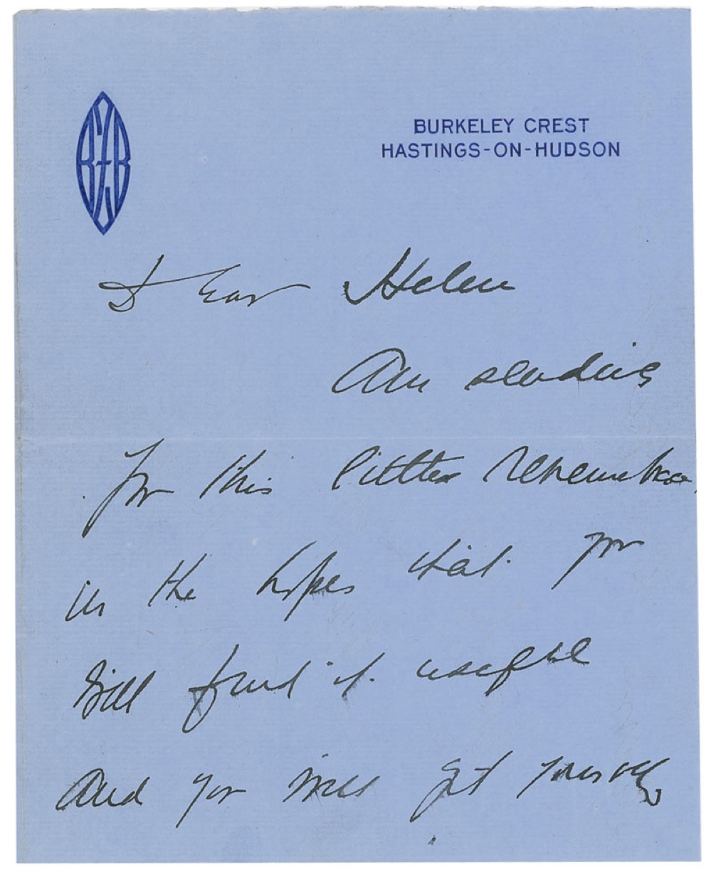 ALS signed “Billie Burke Ziegfeld,” three pages on two adjoining sheets, 6 x 7.5, Burkeley Crest letterhead, no date. Letter to Helen. In part: “Am sending you this little remembrance in the hopes that you will find it useful and you will get yourself some little thing.” In fine condition, with central vertical fold through one letter of signature and some scattered light toning. Pre-certified PSA/DNA and RRAuction COA.
