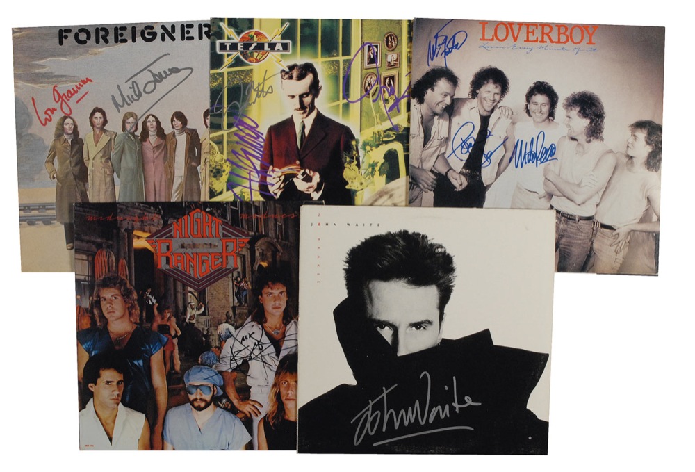 Five items: four albums, Foreigner signed in red ink by Lou Gramm and silver ink by Mick Jones, Loverboy’s Lovin’ Every Minute of It signed in blue felt tip by Mike Reno, Paul Dean, and Matt Fernette, No Brakes signed in silver ink by John Waite, Night Ranger’s Midnight Madness signed in black felt tip by Jack Blades; and a Psychotic Supper flat signed in ink by Jeff Keith, Troy Luccketta, and Frank Hannon. In overall very good to fine condition with scattered creasing and surface wear. The albums are included. RRAuction COA.