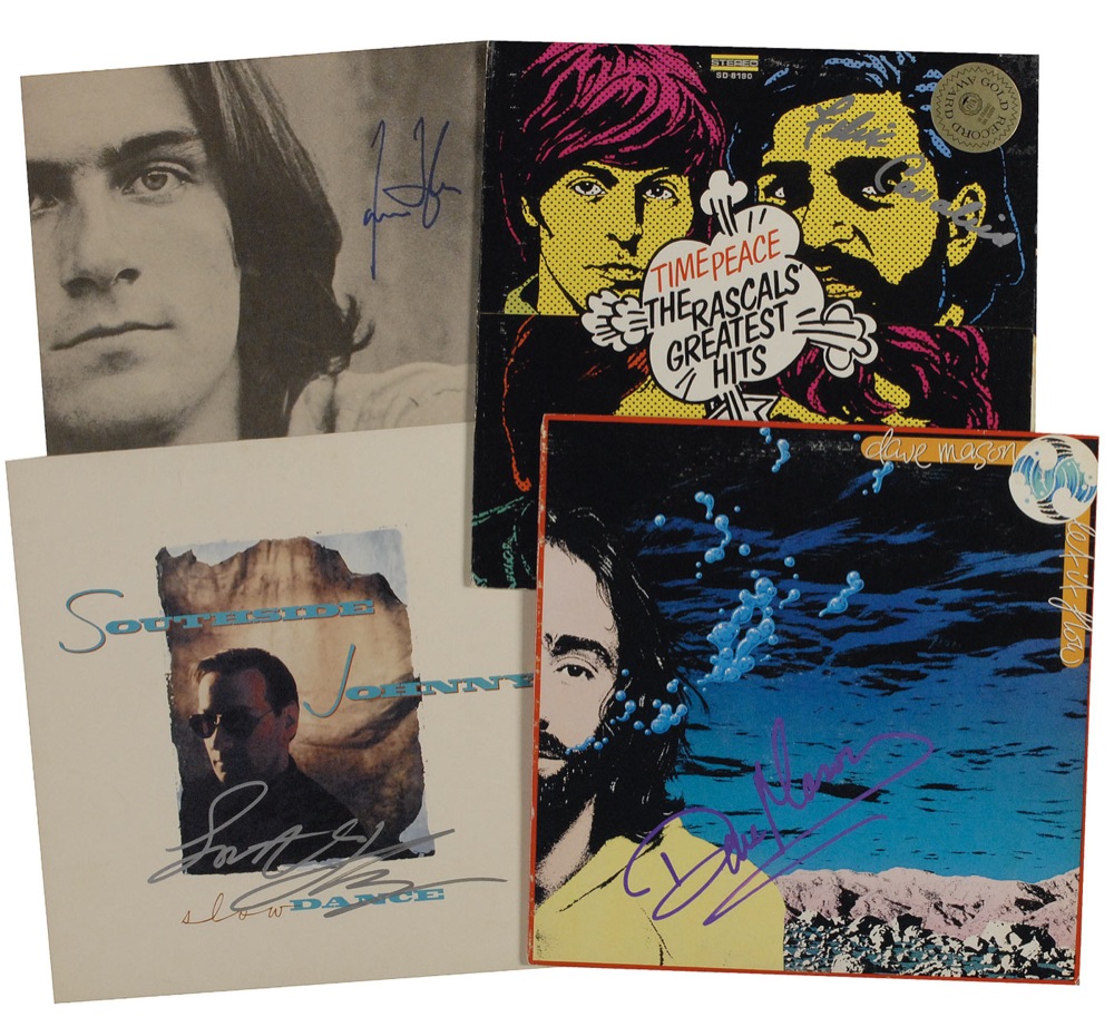 Four items: two albums, Let It Flow signed in purple ink by Dave Mason, and The Rascals’ Greatest Hits signed in silver ink by Felix Cavaliere; Slow Dance album flat signed in silver ink by Southside Johnny; and a 22 x 11 ‘Sweet Baby James’ poster signed in blue felt tip by James Taylor. In overall very good to fine condition with scattered creasing, surface wear, and a central vertical fold (as issued) to the poster. The albums are included. RRAuction COA.