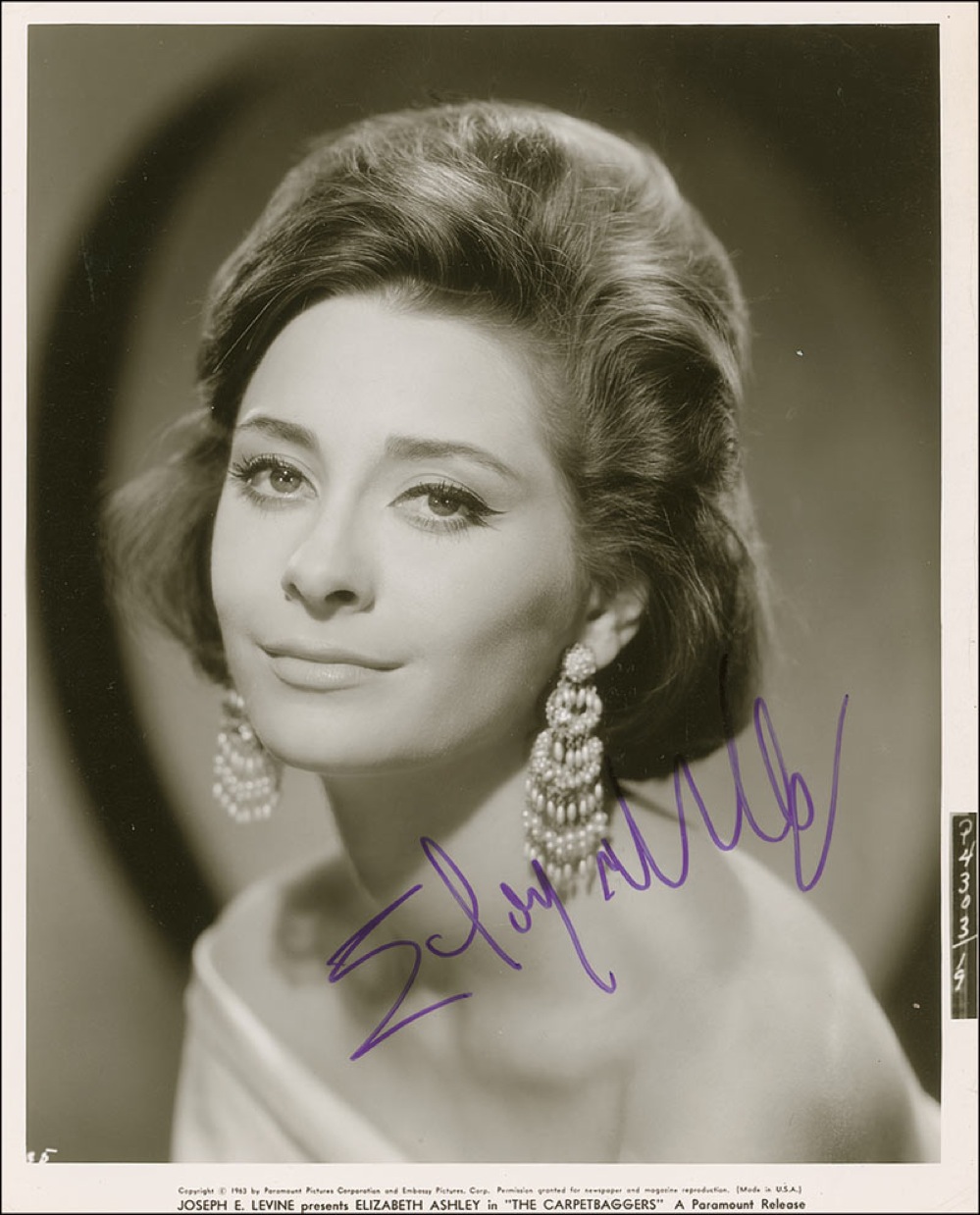 Glossy 8.25 x 10 promotional photo of the smiling actress from The Carpetbaggers, signed in purple felt tip. In fine condition, with scattered creases at the edges and on the image, and a small scratch to the emulsion at the top border. Pre-certified PSA/DNA and RRAuction COA.