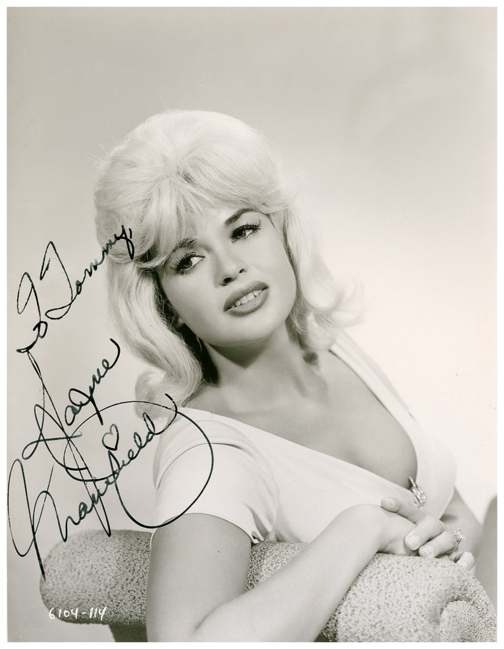 Vintage glossy 7.5 x 9.5 publicity photo of the bombshell looking over her shoulder, signed and inscribed in fountain pen “To Tommy, Jayne Mansfield.” A few creases, some of which touch her facial area, slightly irregular ink adhesion in a few spots, and trimmed edges, otherwise fine condition. A gorgeous pose. Pre-certified PSA/DNA and RRAuction COA.