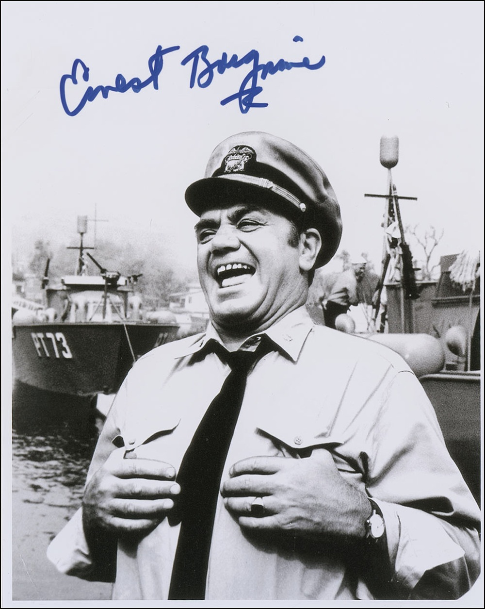 Satin-finish 8 x 10 photo of Borgnine as Quinton McHale, signed in-person in blue felt tip. In very fine condition. Pre-certified PSA/DNA and RRAuction COA.