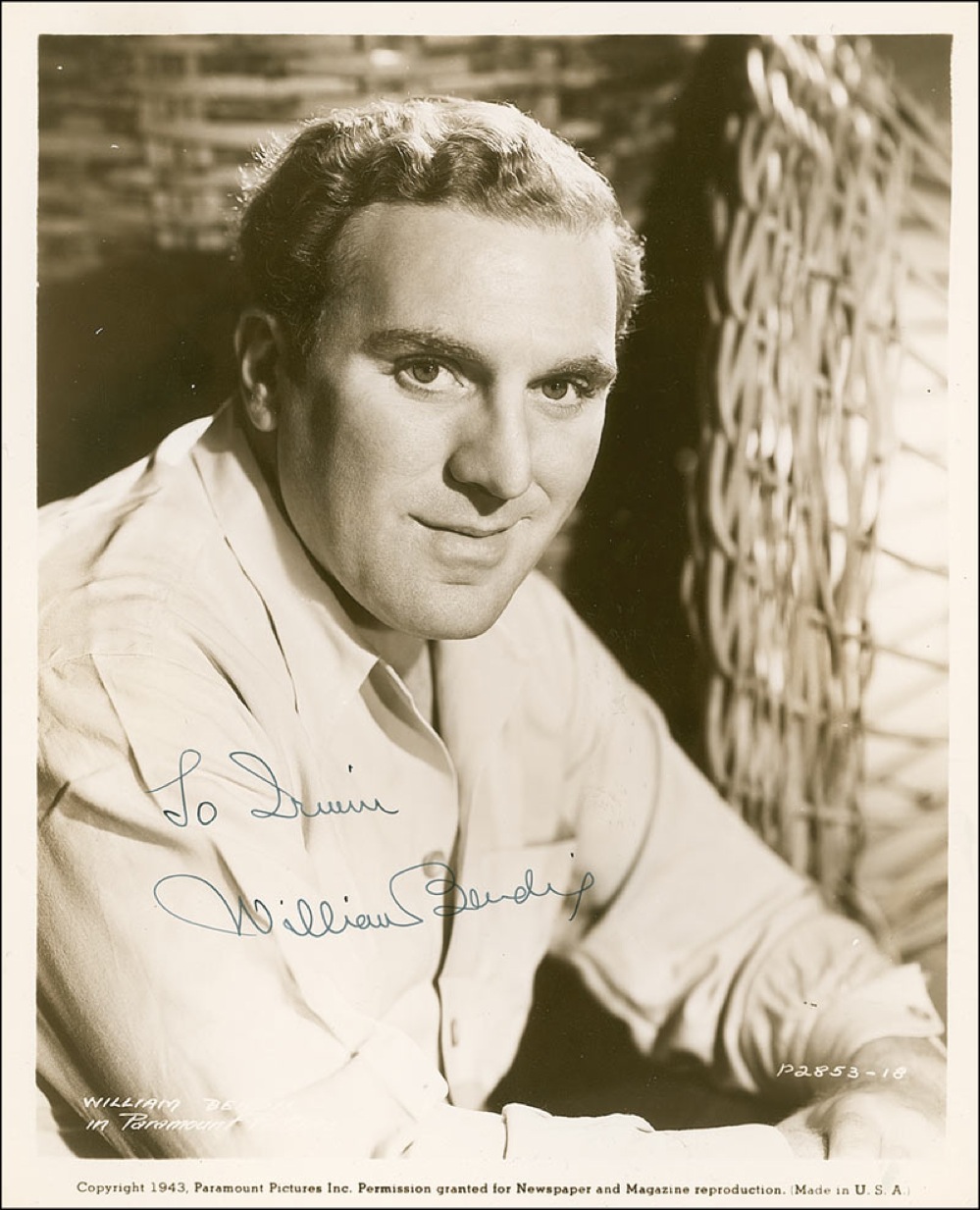Vintage glossy 8 x 10 Paramount Pictures publicity photo, signed and inscribed in fountain pen “To Irwin, William Bendix.” In fine condition, with light surface wear. Pre-certified PSA/DNA and RRAuction COA.