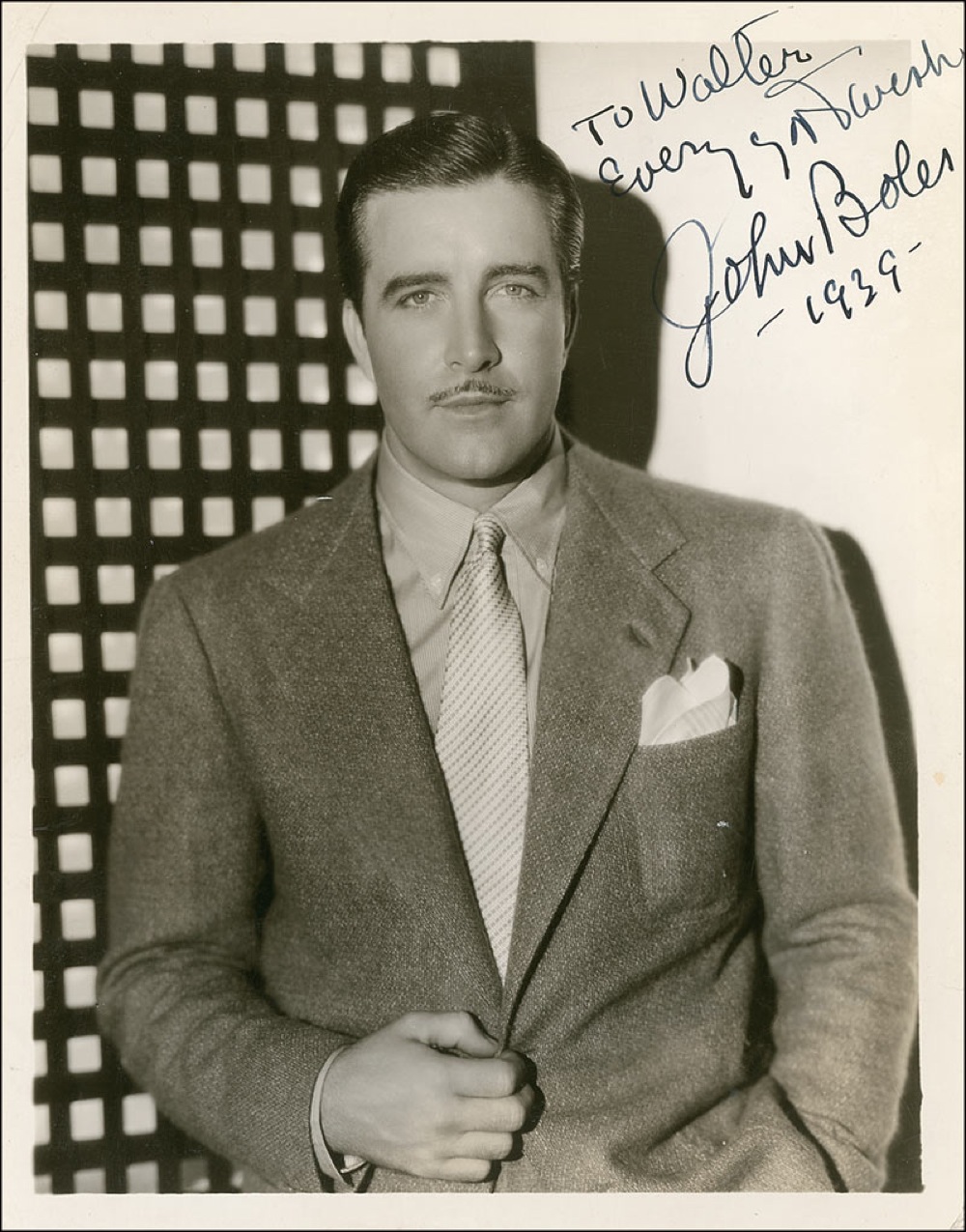 Vintage glossy 8 x 10 photo of Boles in a suit and tie, signed and inscribed in fountain pen “To Walter, Every good wish, John Boles 1939.” Light creases, surface scratches and impressions, and a faint bit of toning along the right edge, otherwise fine condition. Pre-certified PSA/DNA and RRAuction COA.
