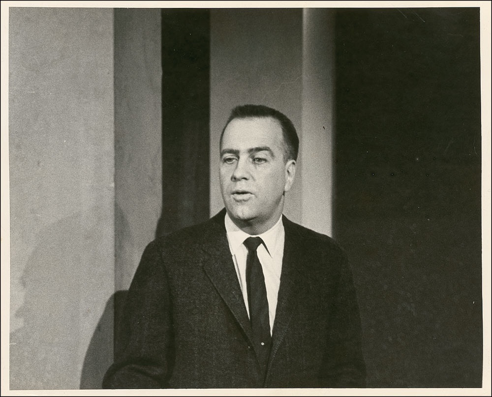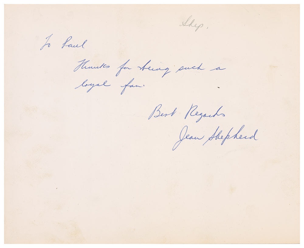 Radio and TV personality, writer, and actor (1921–1999) best-known to modern audiences for the film A Christmas Story, which he narrated and co-scripted, based on his own semi-autobiographical stories. Glossy 10 x 8 photo, signed and inscribed in blue ballpoint “To Paul, Thanks for being such a loyal fan. Best regards, Jean Shepherd.” Impressions to image from signature and inscription on reverse, and some scattered light toning, otherwise fine condition. Accompanied by the original RKO Radio Pictures mailing envelope. RRAuction COA.