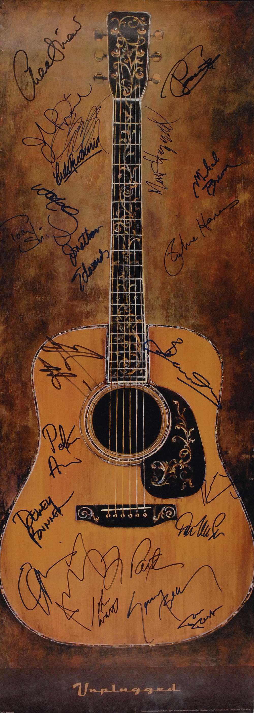 Color 13.5 x 37.5 print of an artist’s work of an acoustic guitar, signed in blue and black felt tip by 24 acoustic greats. Signers are: Willie Nelson, Merle Haggard, John Prine, Don McLean, Richie Havens, Judy Collins, Chad & Jeremy including Chad Stuart & Jeremy Clyde, Emmylou Harris, America’s Dewey Bunnell and Gerry Beckley, Brewer & Shipley’s Tom Shipley and Michael Brewer, Peter & Gordon’s Peter Asher and Gordon Waller, Indigo Girls’s Amy Ray and Emily Sailers, John Hiatt, Tom Paxton, Tom Rush, Jonathan Edwards, and Edwin McCain. Rolled and in fine condition, with some scattered light dings and creases. Pre-certified PSA/DNA and RRAuction COA.