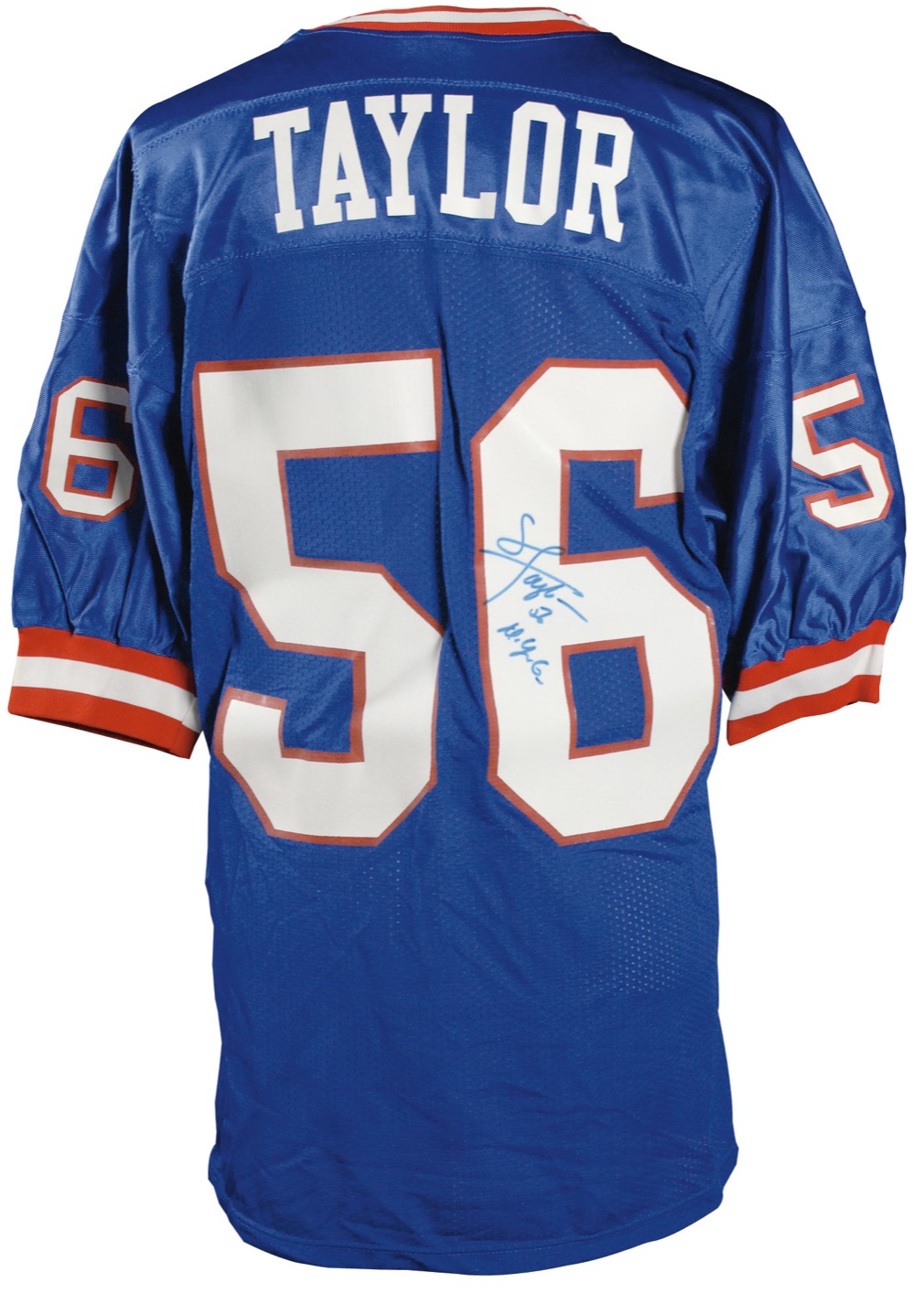 Official Russell New York Giants football jersey signed in blue felt tip on the number on the back, “Lawrence Taylor 56 N.Y.G.” In fine condition, with a slightly fuzzy appearance to signature. Pre-certified Steve Grad/PSA/DNA and RRAuction COA.