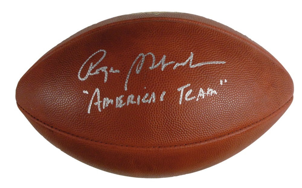 Official Wilson “The Duke” football signed in silver ink on a side panel, “Roger Staubach, ‘America’s Team.’” In very fine condition with a James Spence authentication label affixed to ball. Accompanied by a certificate of authenticity from James Spence. Pre-certified Steve Grad/PSA/DNA and RRAuction COA.