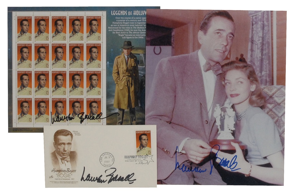 Three items: color glossy 8 x 10 photo of Bacall and Humphrey Bogart, signed in blue felt tip by Bacall; a commemorative cover bearing a cachet of Bogart, signed in black felt tip; and a full sheet of Bogart commemorative postage stamps, signed along the bottom row of stamps in black felt tip. In fine condition. RRAuction COA.